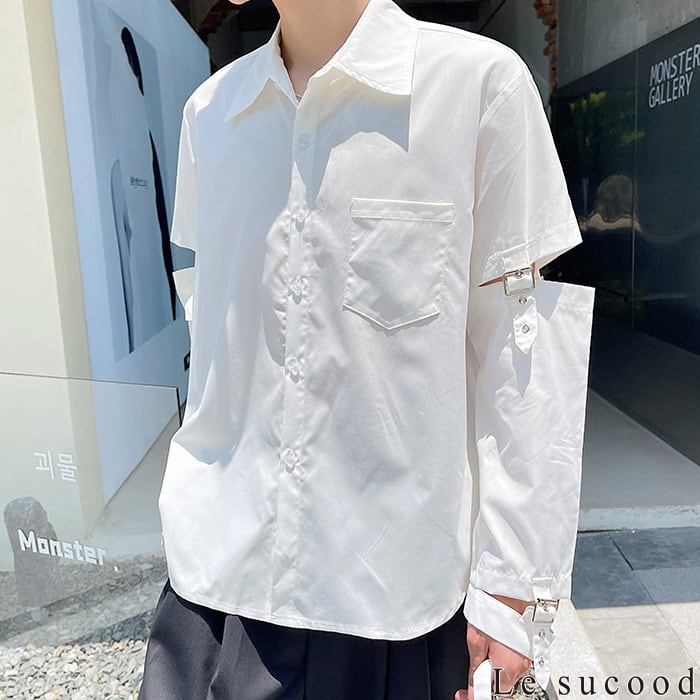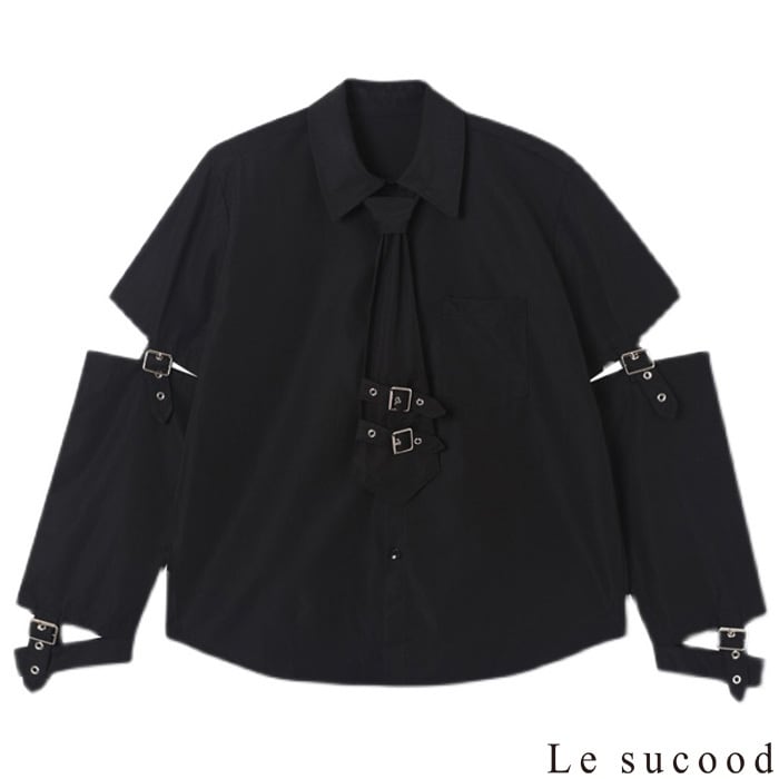 【Le sucood】【お支払い確認後20日以内発送】ネクタイ付袖スリットパンクシャツ 長袖シャツ ネクタイ付きシャツ デザインシャツ ロングシャツ カジュアルシャツ ワークシャツ 白シャツ 変形 無地 スリット ストラップ モノトーン パンク ロック メンズ モード系 ストリート サロン系 原宿系 青文字系 | Le sucood