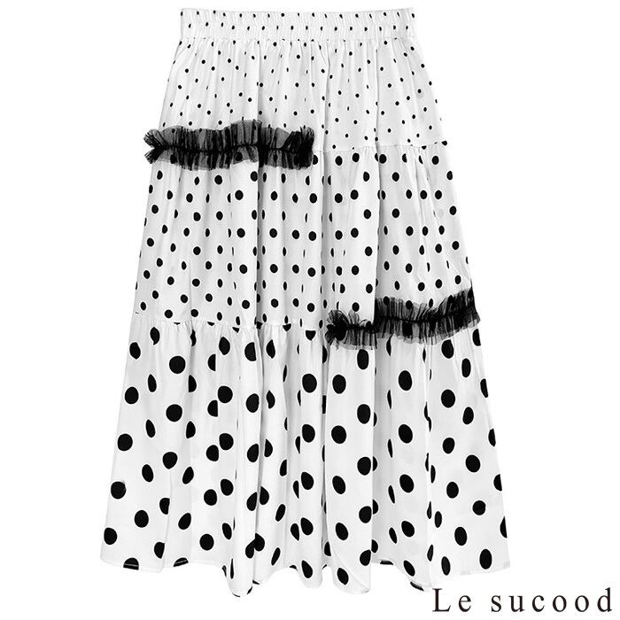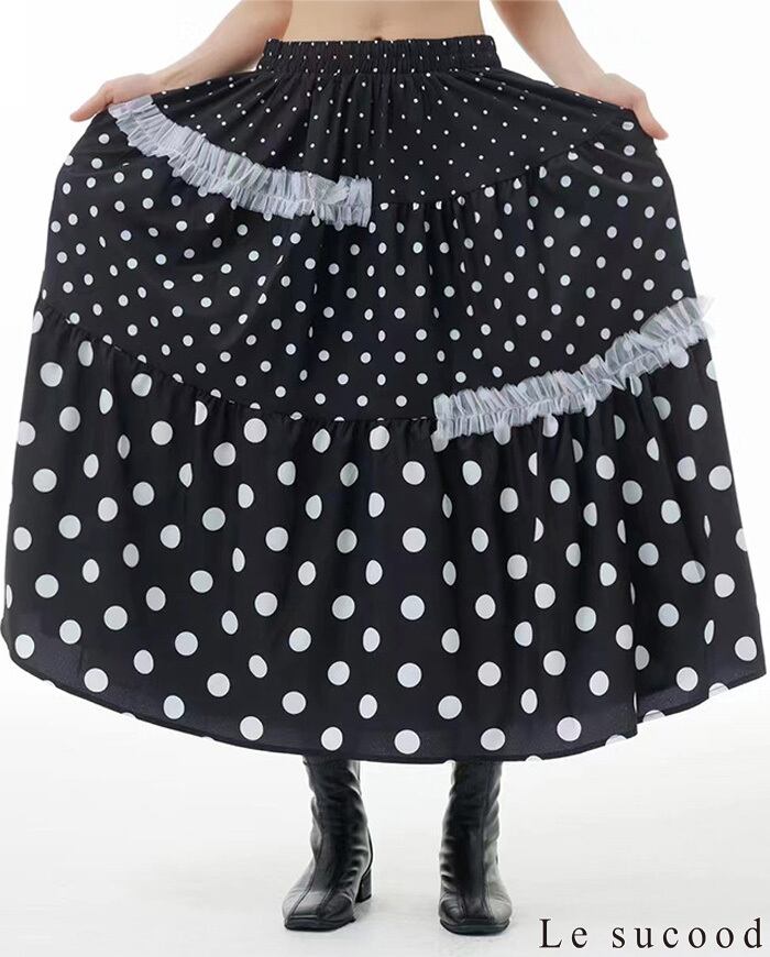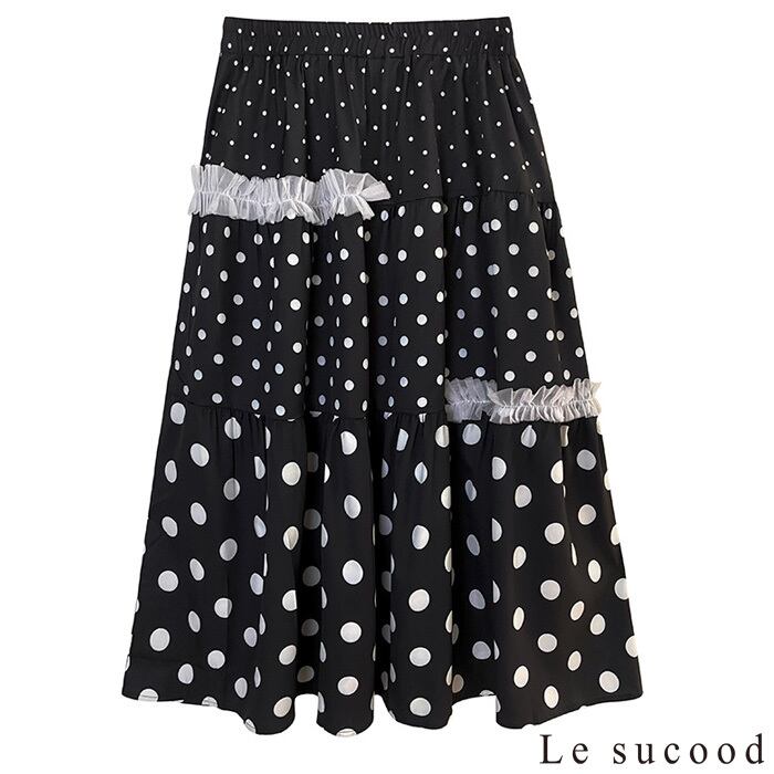 【Le sucood】【お支払い確認後20日以内発送】ドットティアードロングスカート ドットスカート デザインスカート フレアスカート ミモレ丈 Aライン 水玉 レトロ クラシカル フリル ウエストゴム 大人カジュアル 大人可愛い フェミニン きれいめ シンプル 青文字系 レディース モード系 ファッション | Le sucood