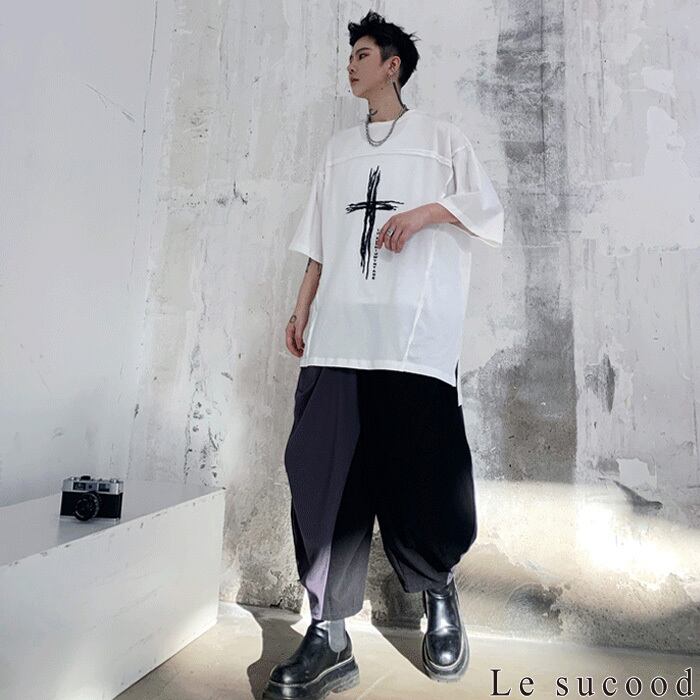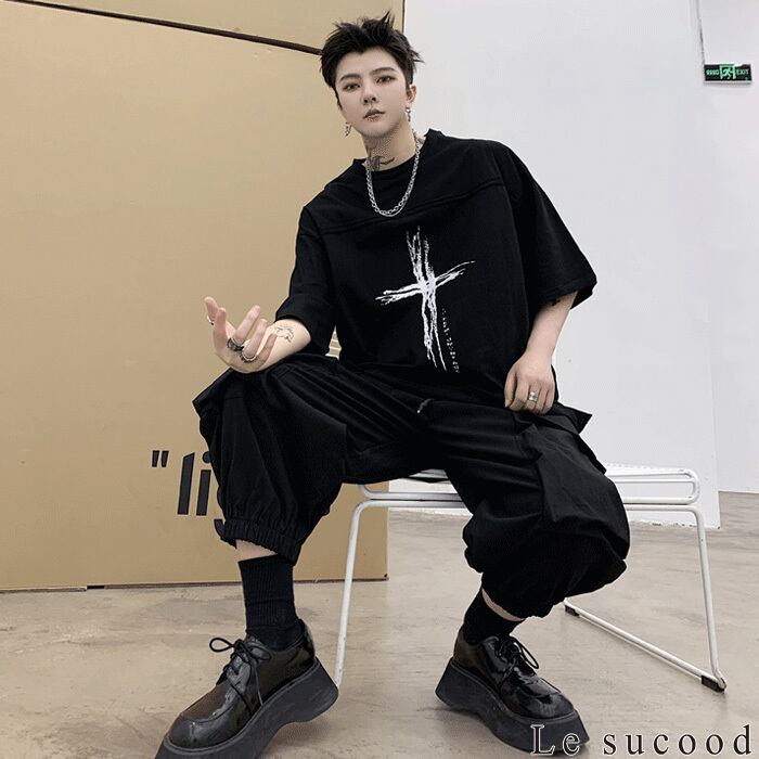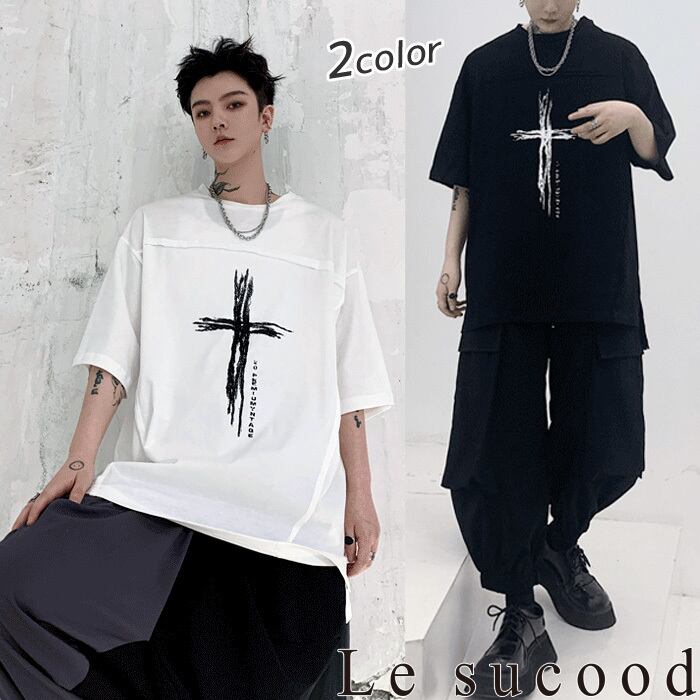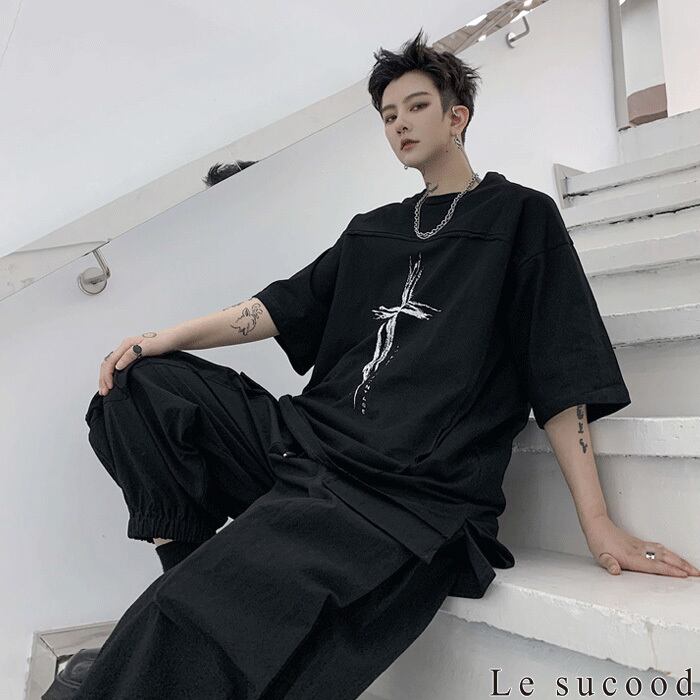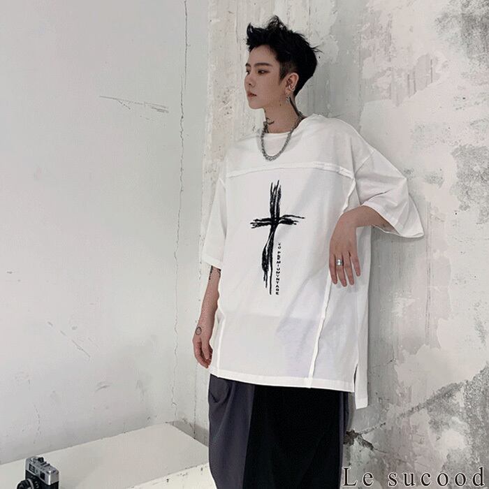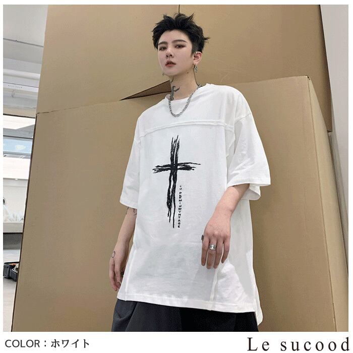【Le sucood】【お支払い確認後20日以内発送】 クロスグラフティTシャツ フットボールTシャツ グラフィックTシャツ ビッグTシャツ ビッグシルエット オーバーサイズ ゆったり ドロップショルダー 五分袖 半袖 十字架 TEE カジュアル メンズ きれいめ モード系 ストリート サロン系 原宿系 青文字系 | Le sucood