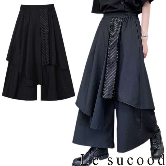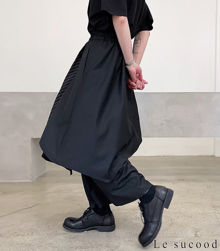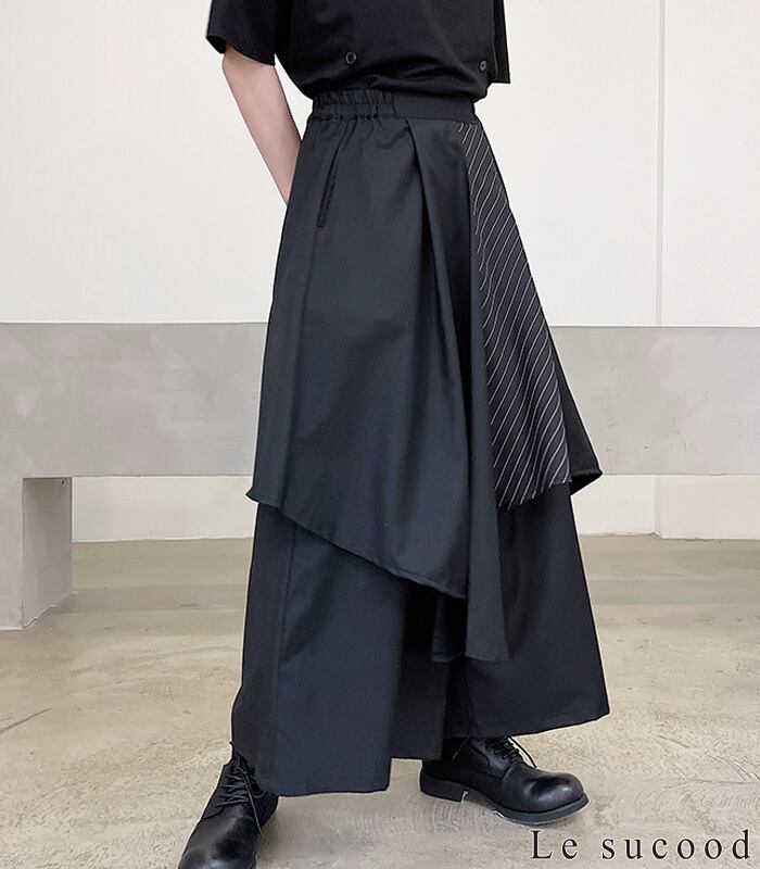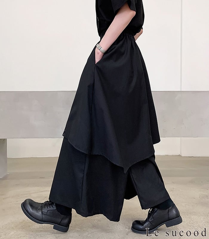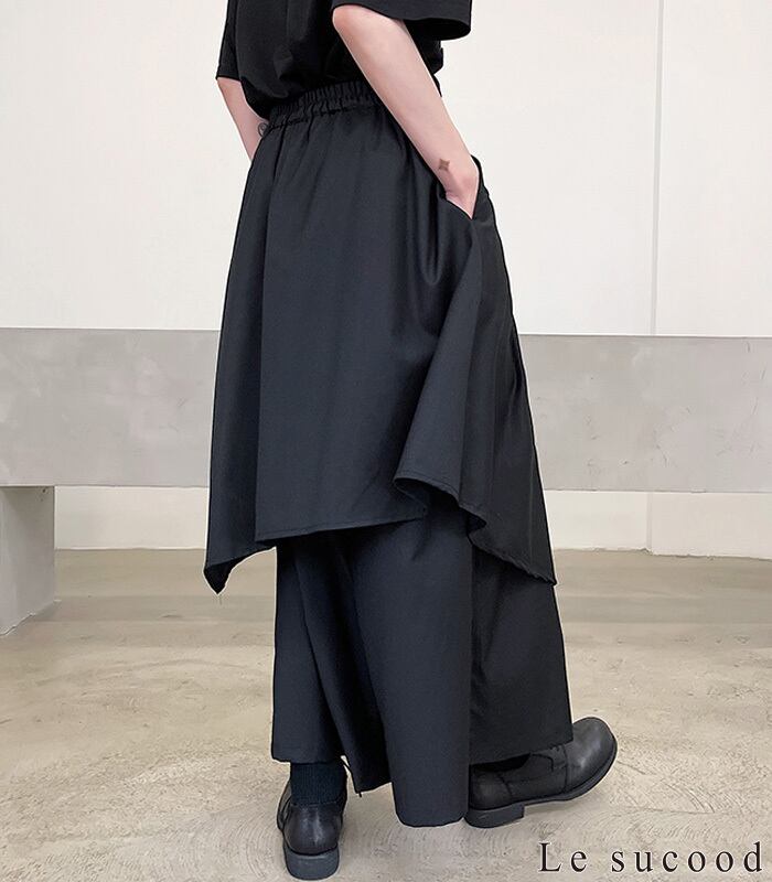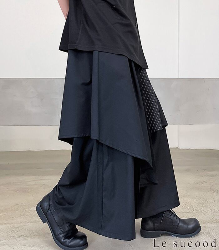 【Le sucood】【お支払い確認後20日以内発送】レイヤード風アシメキュロットパンツ ワイドレッグパンツ ワイドパンツ ガウチョパンツ ルーズキュロット スカンツ フレアパンツ レイヤードパンツ カフェパンツ ラップパンツ モノトーン メンズ モード系 サロン系 個性的 原宿系 青文字系 ファッション | Le sucood