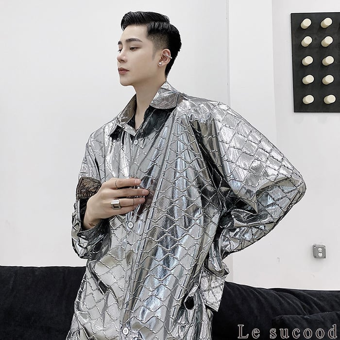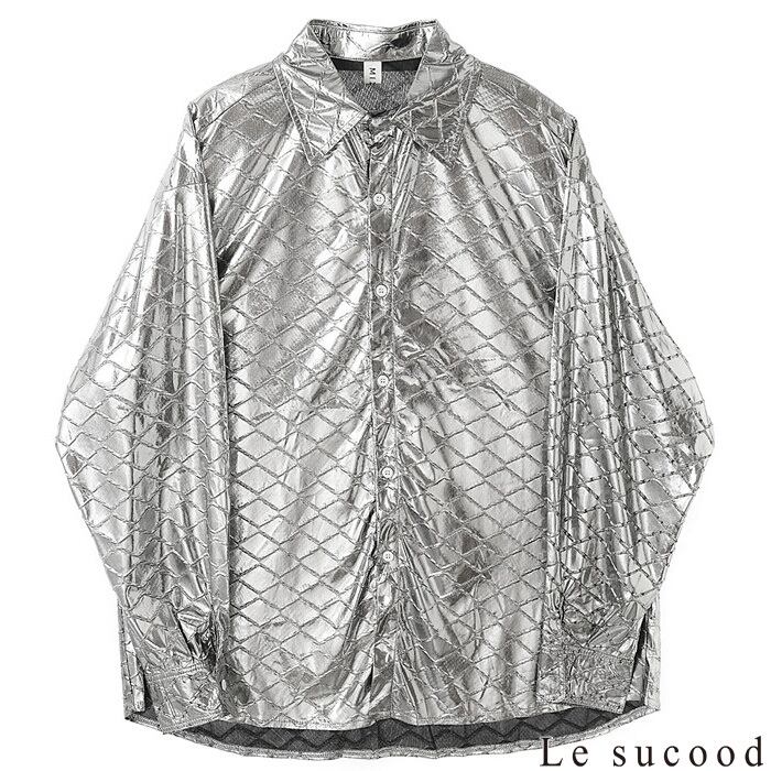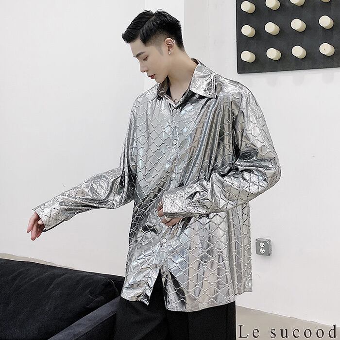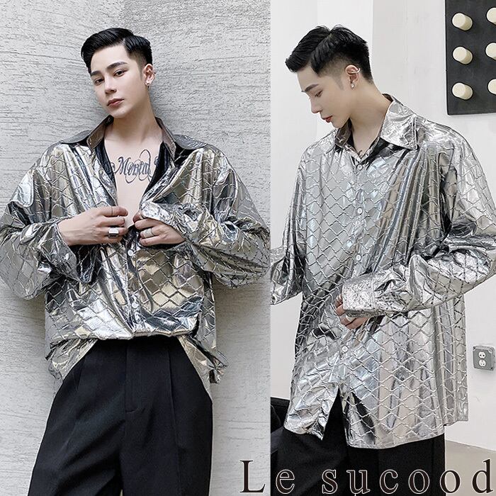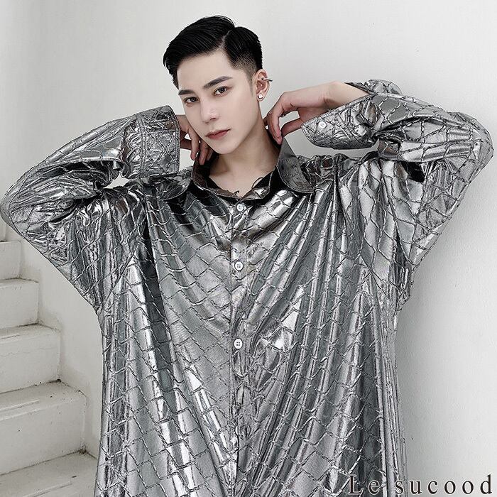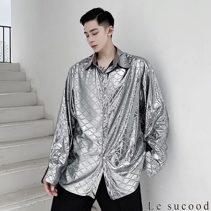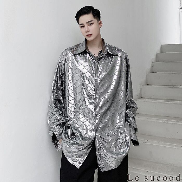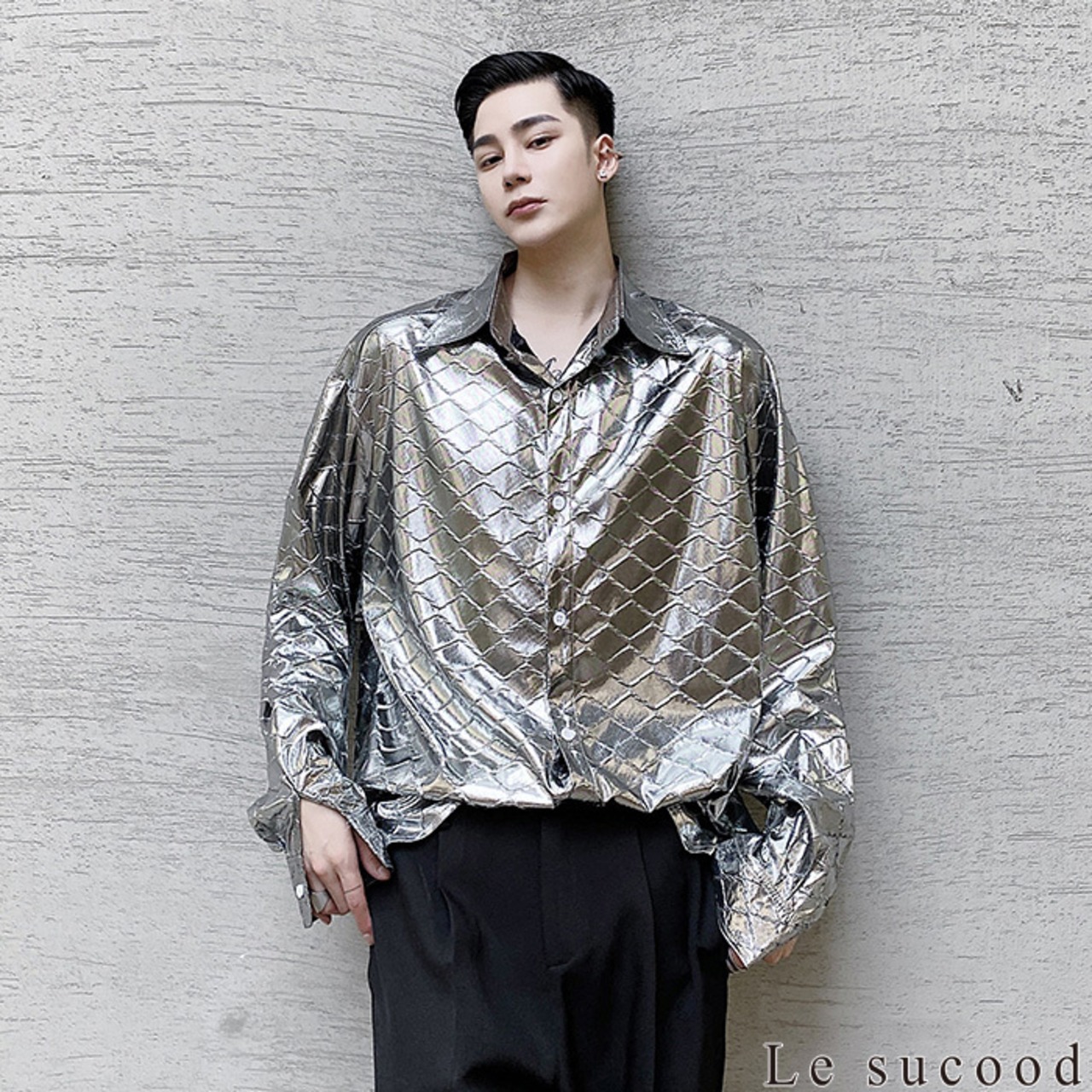 【Le sucood】【お支払い確認後20日以内発送】 ダイヤエンボスシャイニーシャツ エンボスシャツ シャイニーブラウス オーバーサイズシャツ ルーズシャツ カジュアルシャツ ダボシャツ ゆったり ドロップショルダー 羽織り セクシー シンプル メンズ きれいめ モード系 ストリート サロン系 原宿系 青文字系 | Le sucood