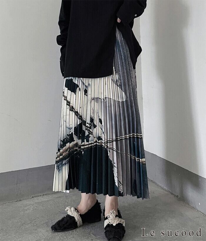 【Le sucood】【お支払い確認後20日以内発送】 油絵柄 プリーツスカート プリーツロングスカート ロングスカート デザインスカート ハイウエスト Aライン ミモレ丈 ウエストゴム レトロデザイン 大人カジュアル きれいめ シンプル 大人カジュアル レディース ストリート モード系 個性的 原宿系 青文字系 | Le sucood