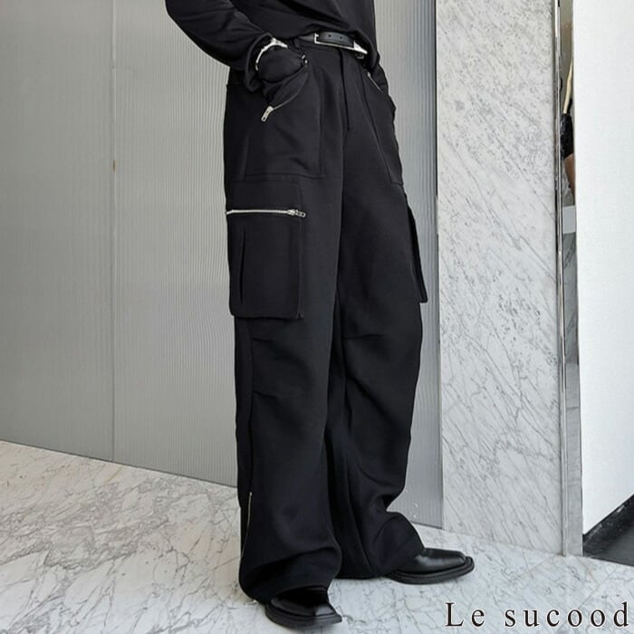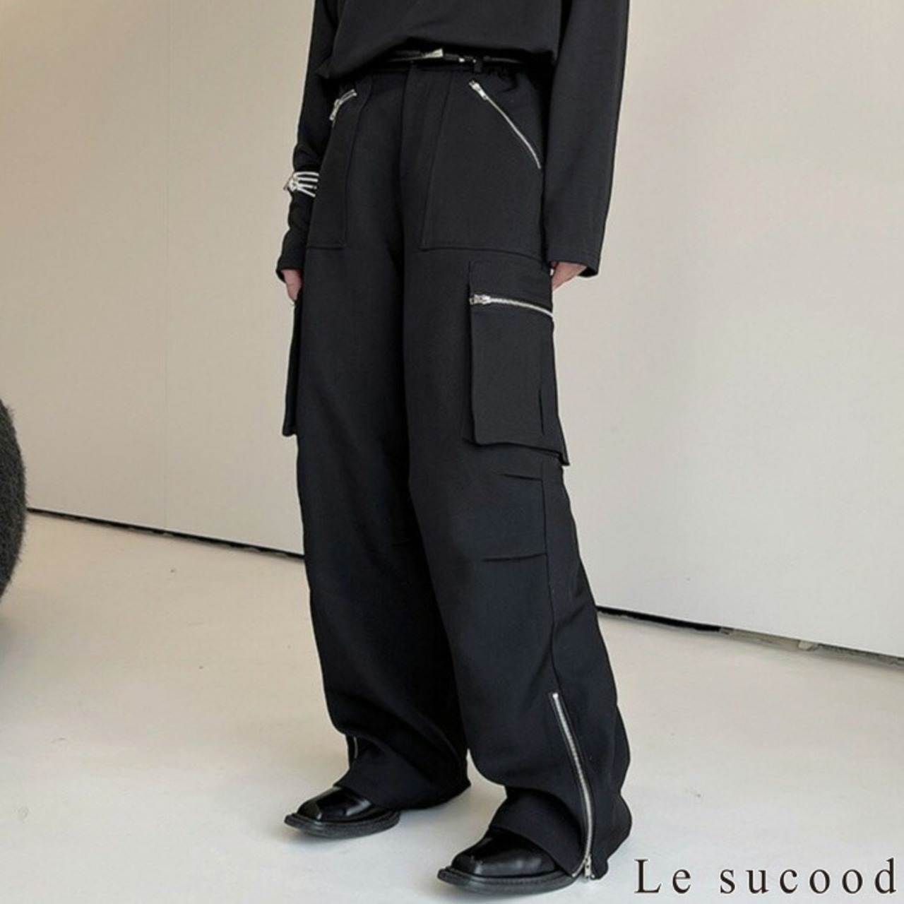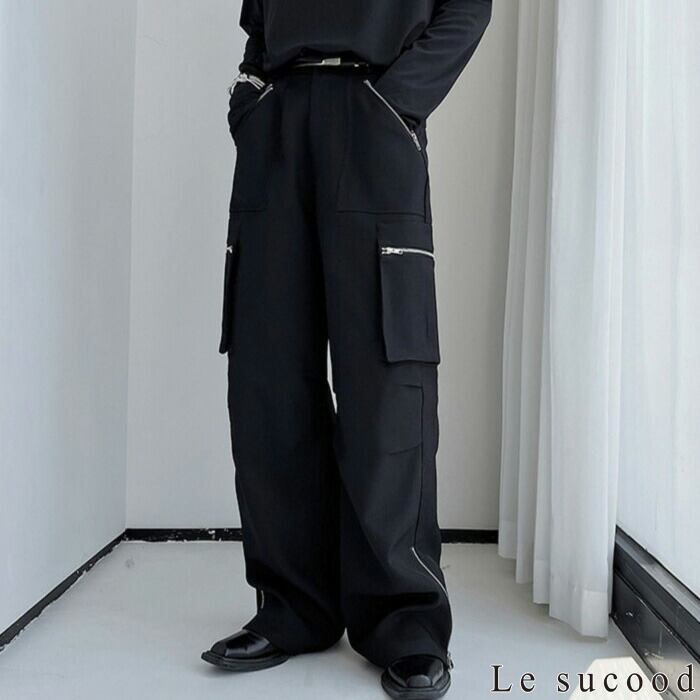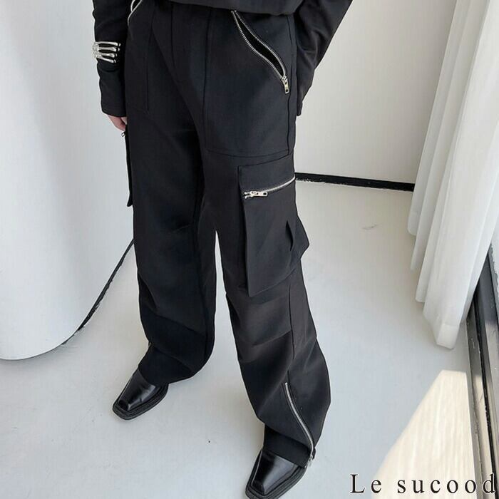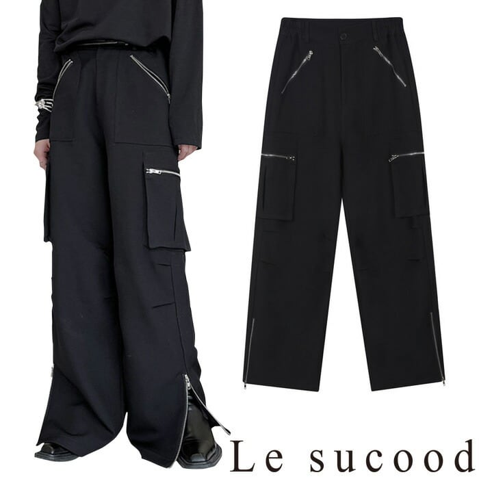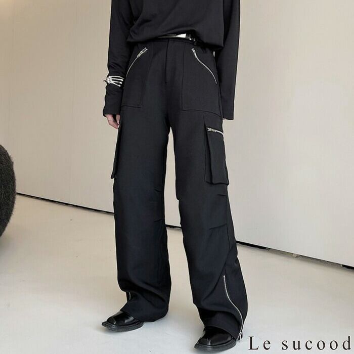 【Le sucood】【お支払い確認後20日以内発送】 裾ジップスリットカーゴパンツ ワイドパンツ スリットパンツ ビッグポケット ロングパンツ ワイドレッグパンツ ルーズパンツ オーバーサイズ ダボパン サイドジップ ゆったり カジュアル メンズ ストリート モード系 サロン系 個性的 原宿系 青文字系 | Le sucood