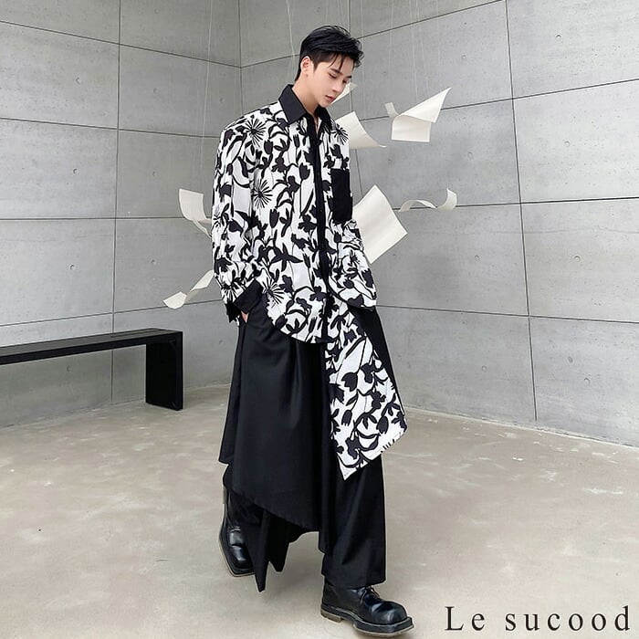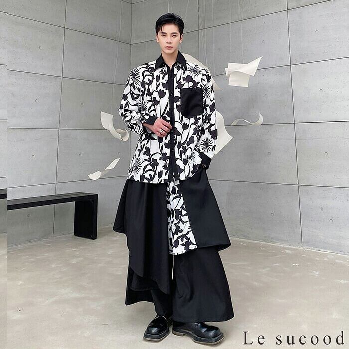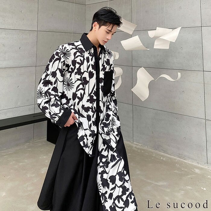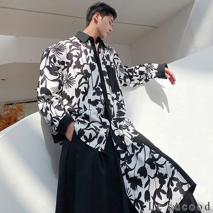 【Le sucood】【お支払い確認後20日以内発送】 モノクロフラワー長袖シャツ ダークフラワーシャツ 花柄シャツ 総柄シャツ デザインシャツ 柄シャツ 花柄プリント フラワーシャツ モノトーン ゆったり カジュアル きれいめ 長袖 個性的 メンズ モード系 ストリート サロン系 原宿系 青文字系 | Le sucood