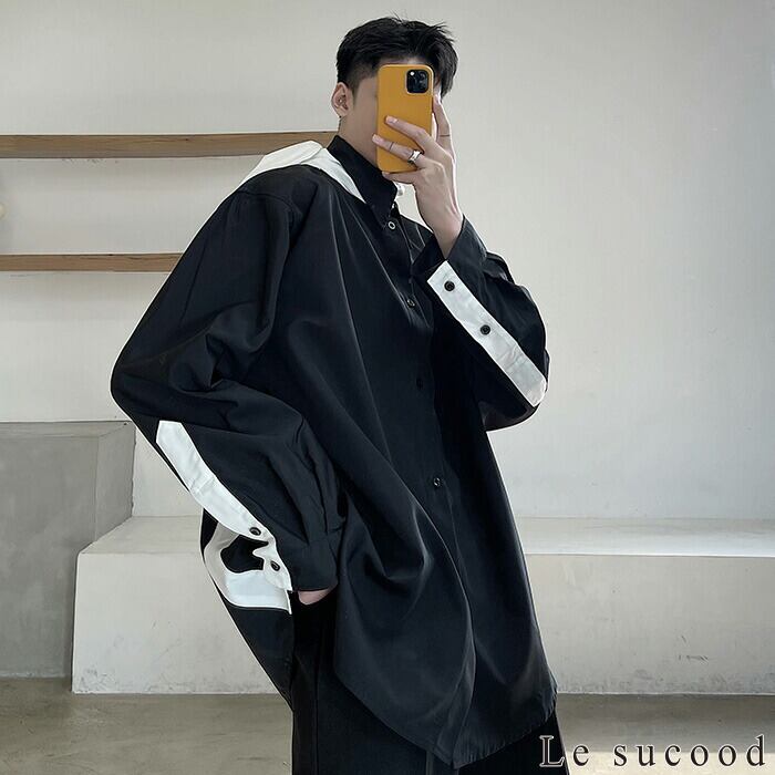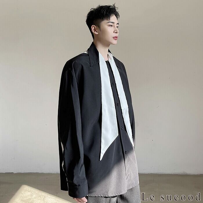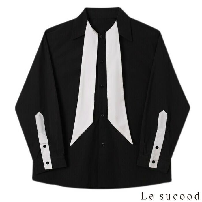 【Le sucood】【お支払い確認後20日以内発送】 コントラストリボンオーバーサイズシャツ カラーシャツ デザインシャツ バイカラーシャツ オーバーサイズシャツ リボンシャツ ゆったり ルーズ 長袖 カジュアル メンズ きれいめ ストリート モード系 サロン系 個性的 原宿系 青文字系 | Le sucood