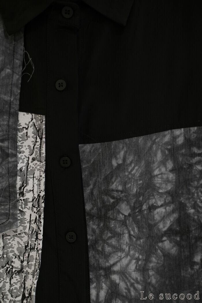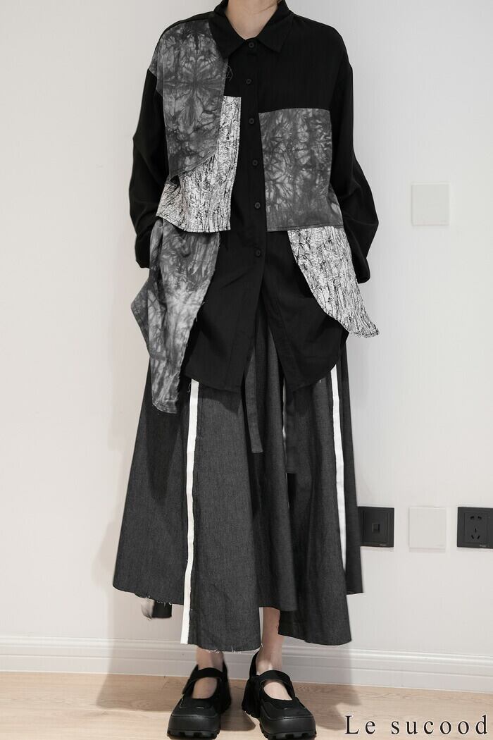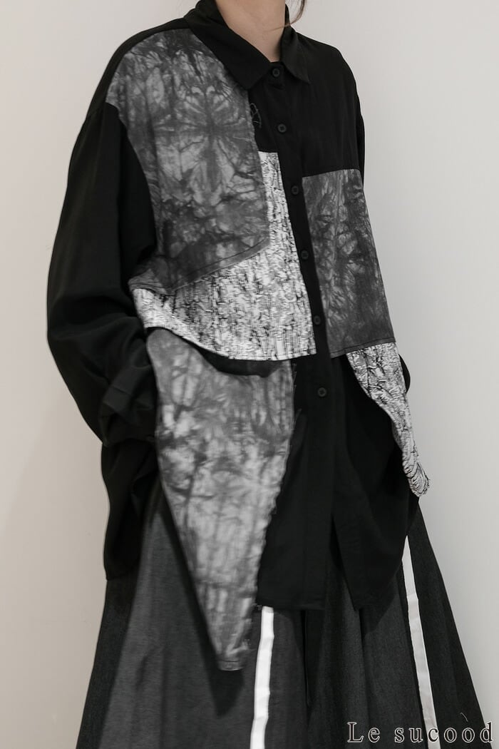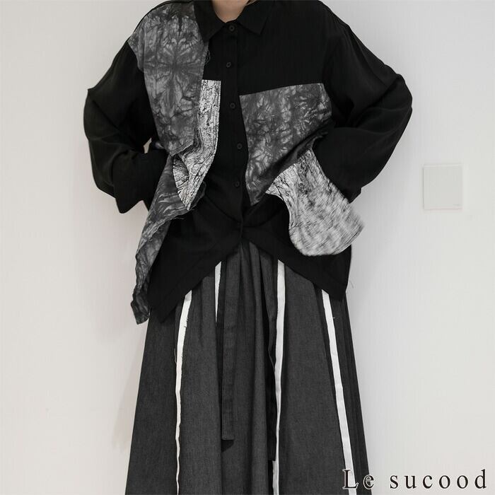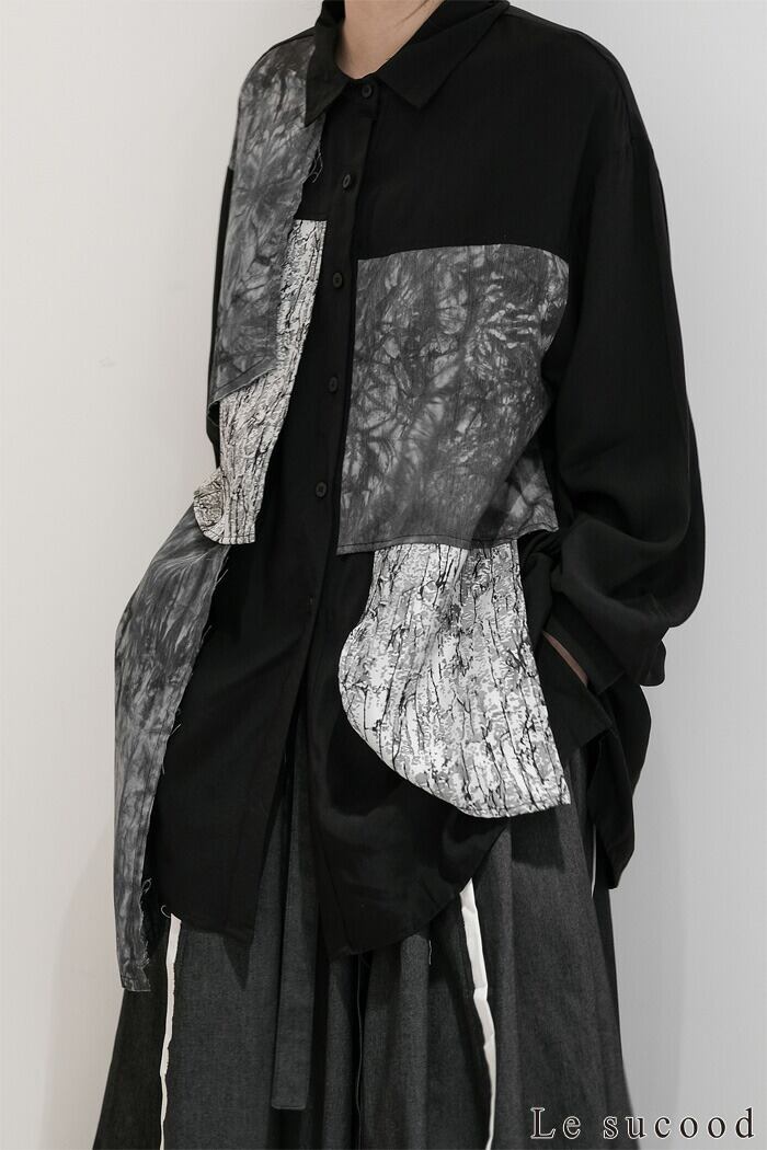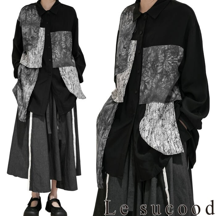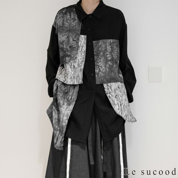【Le sucood】【お支払い確認後20日以内発送】 切り替え 襟付きシャツ モザイク柄 アシメシャツ パッチワークシャツ ルーズシャツ オーバーサイズシャツ ドロップショルダー 長袖 ゆったり ルーズ モノトーン カジュアル レディース きれいめ ストリート モード系 サロン系 個性的 原宿系 青文字系 | Le sucood