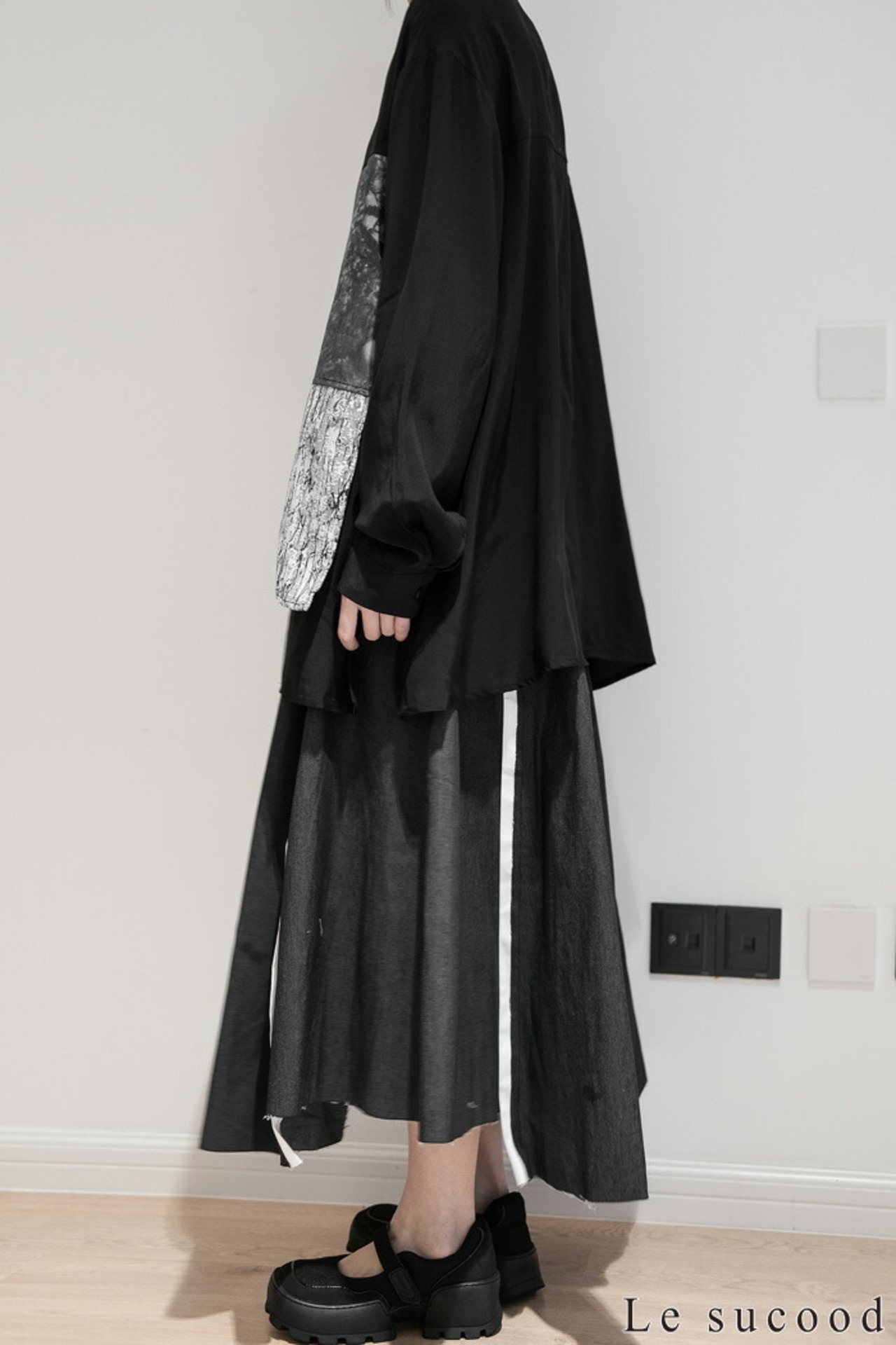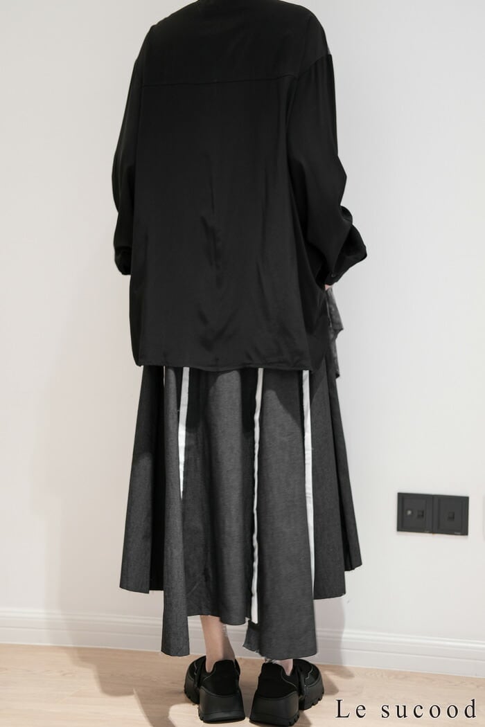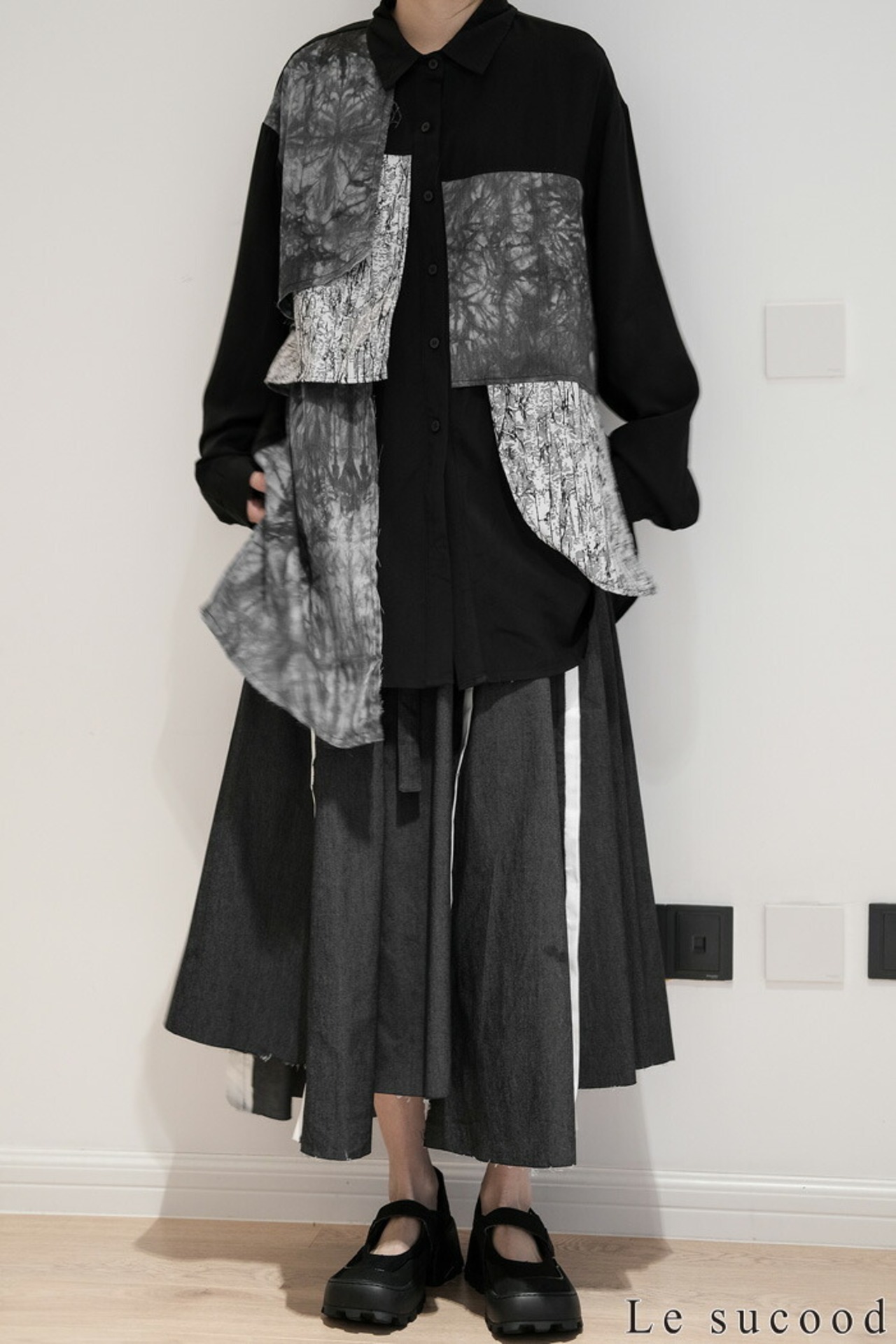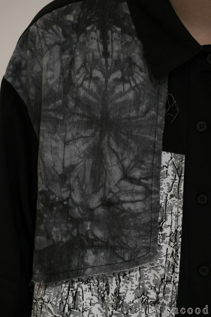【Le sucood】【お支払い確認後20日以内発送】 切り替え 襟付きシャツ モザイク柄 アシメシャツ パッチワークシャツ ルーズシャツ オーバーサイズシャツ ドロップショルダー 長袖 ゆったり ルーズ モノトーン カジュアル レディース きれいめ ストリート モード系 サロン系 個性的 原宿系 青文字系 | Le sucood