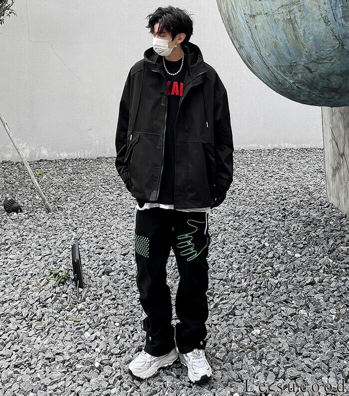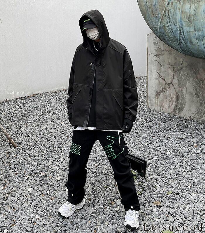 【Le sucood】【お支払い確認後20日以内発送】 ヒップホップウインドブレーカー マウンテンパーカー フード付きブルゾン マンパ アウトドアジャケット ジャンパー アウター 長袖 羽織 モノトーン カジュアル メンズ レディース ユニセックス ストリート モード系 サロン系 個性的 原宿系 青文字系 | Le sucood