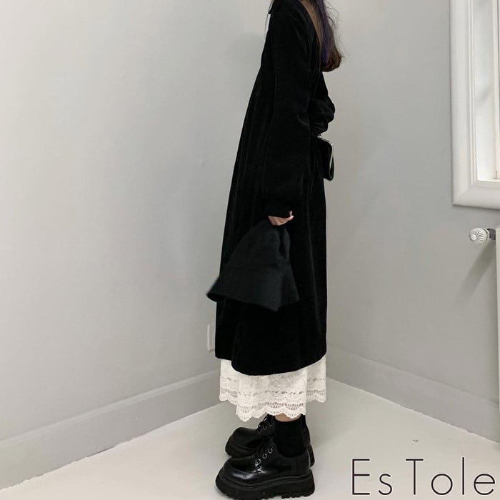 【お支払い確認後20日以内発送】EsTole レトロブラックワンピース ロングワンピース ボタンワンピース シンプル ベーシック ひざ丈 羽織り カーディガン ゆったり ワンピース レディース モード系 大人可愛い 原宿系 青文字系 エストール