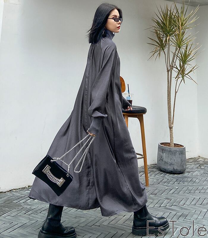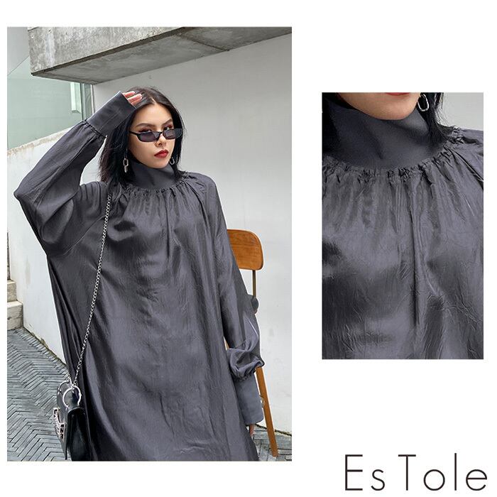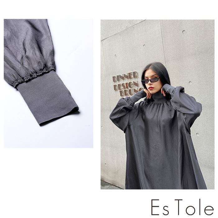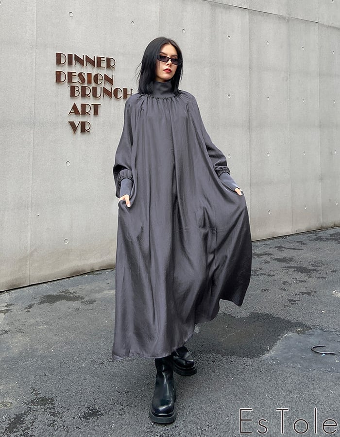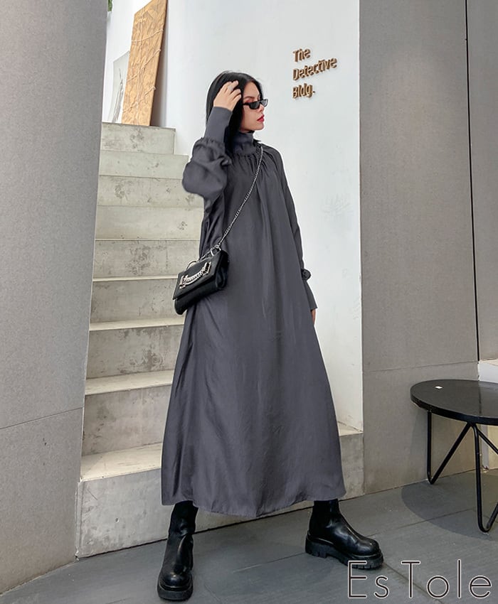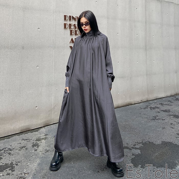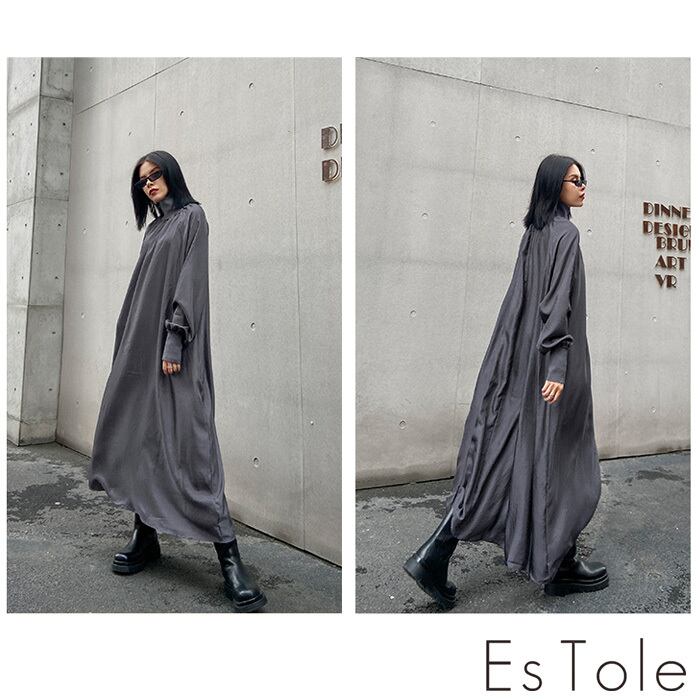 【お支払い確認後20日以内発送】EsTole グレーハイネックワンピース ロングワンピース マキシ丈 Aラインワンピース マキシワンピース シャーリング マキシ丈 きれいめワンピース 長袖 レディース モード系 個性的 原宿系 青文字系 エストール | Le sucood