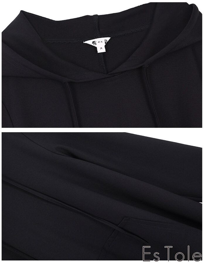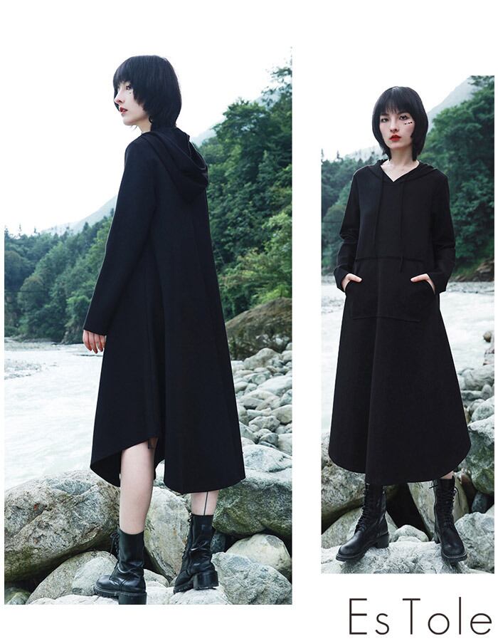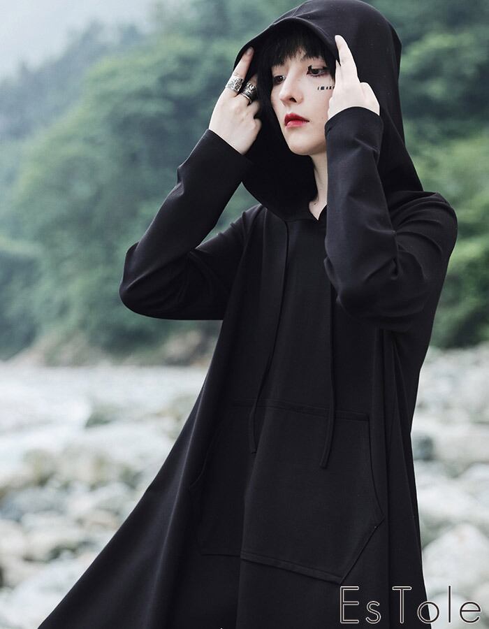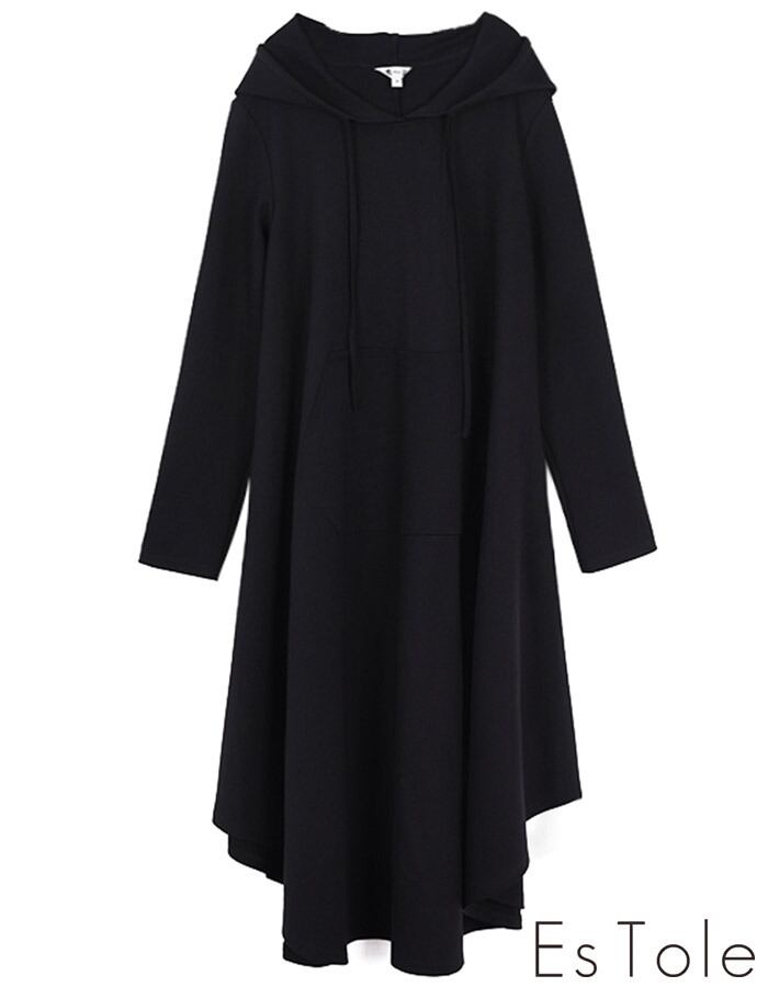 【お支払い確認後20日以内発送】EsTole 黒無地ロングパーカー パーカーワンピ ロングワンピース 変形 Aライン ミモレ丈 ドレープ プルオーバー ブラック モノトーン ストリート系 レディース モード系 個性的 原宿系 青文字系 エストール | Le sucood