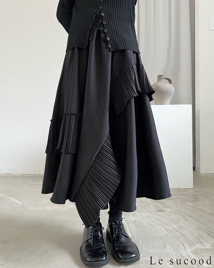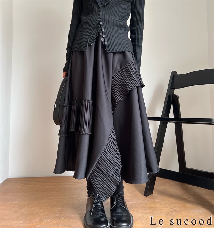 【お支払い確認後20日以内発送】Le sucood フリンジ アシメスカート プリーツスカート デザインスカート ロングスカート イレギュラースカート Aライン 無地 ハイウエスト ウエストゴム マキシ丈 Aライン 無地 モノトーン レディース モード系 サロン系 個性的 原宿系 青文字系 ファッション | Le sucood