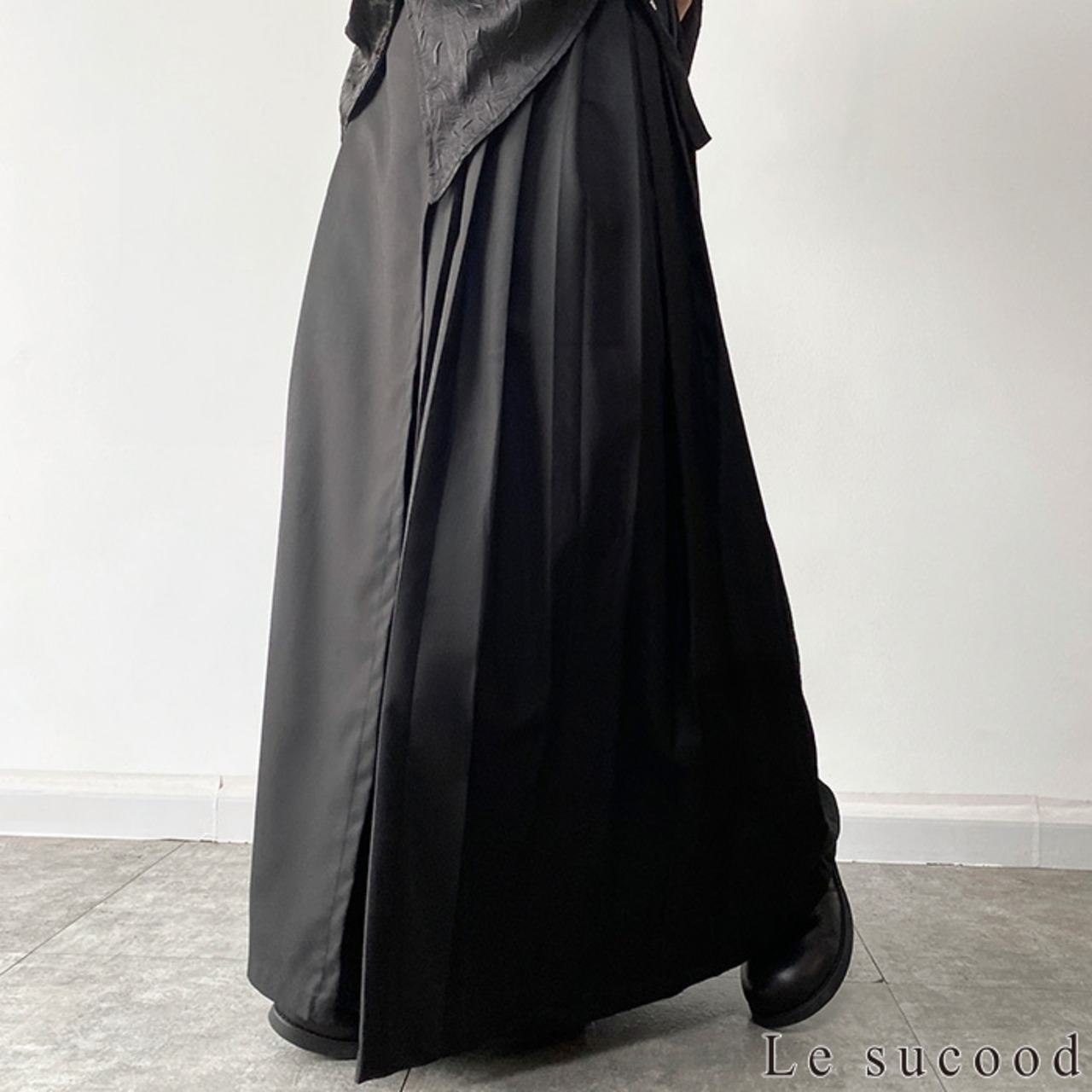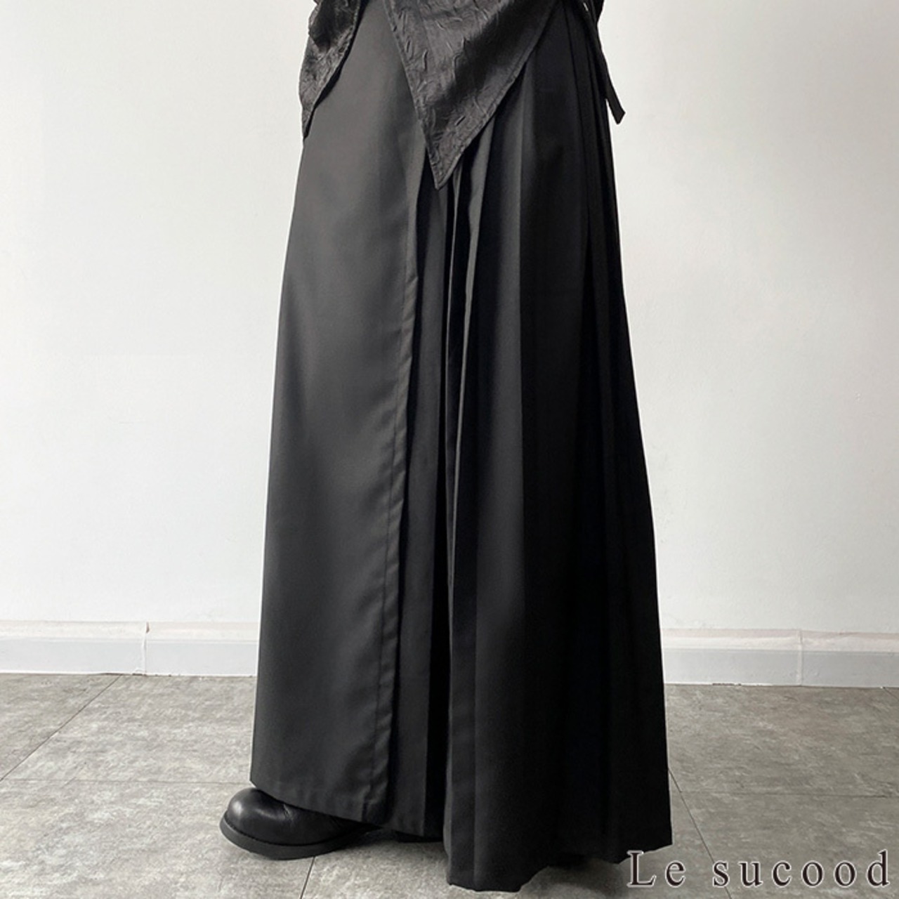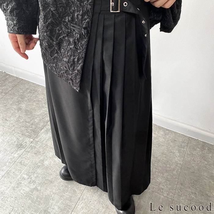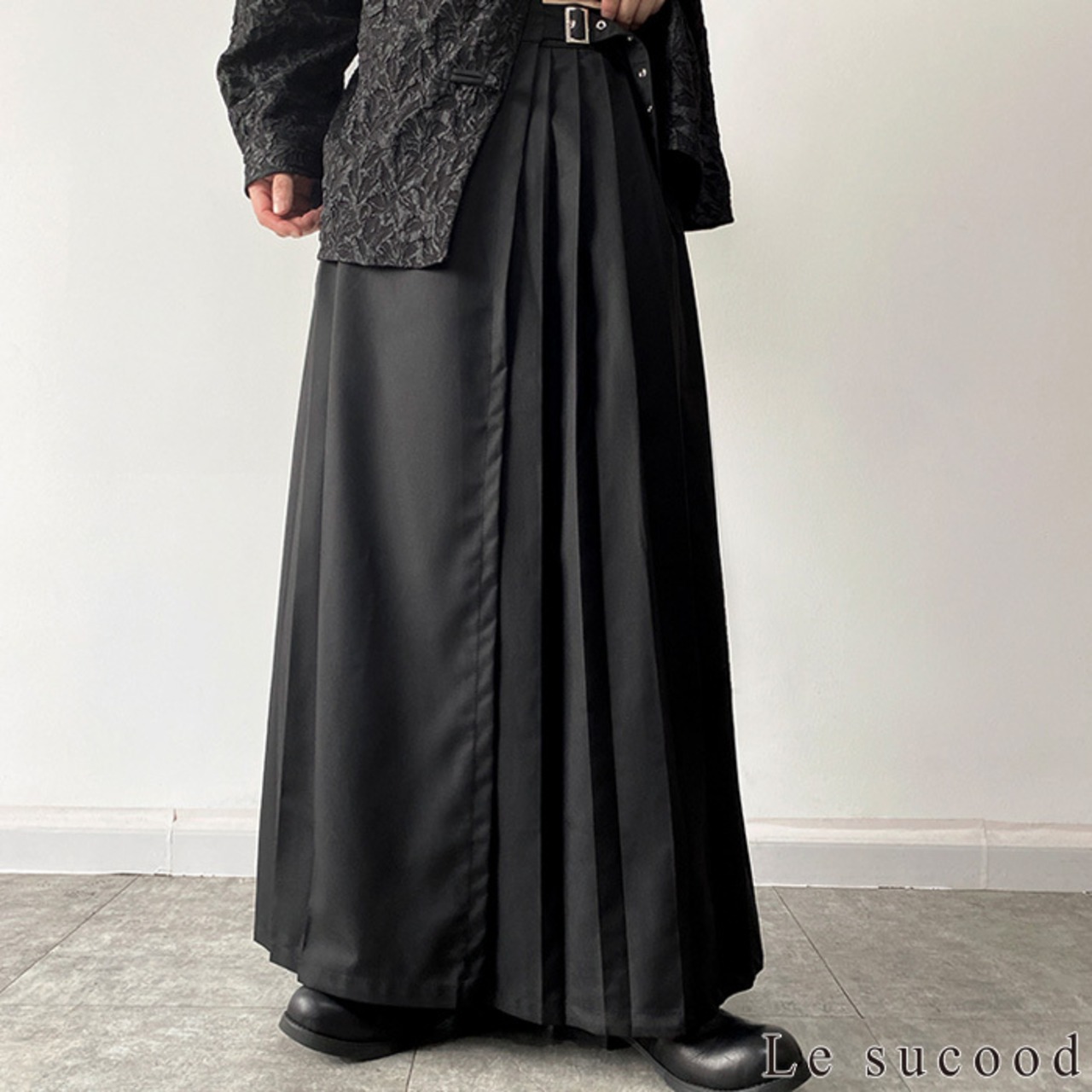 【お支払い確認後20日以内発送】Le sucood ベルト一体型 プリーツワイドパンツ メンズ 袴パンツ プリーツパンツ 変形ワイドパンツ キュロット ワイドレッグパンツ スカーチョ ロングスカート オーバーサイズ ゆったり カジュアル フェミニン ストリート モード系 サロン系 個性的 原宿系 青文字系 | Le sucood
