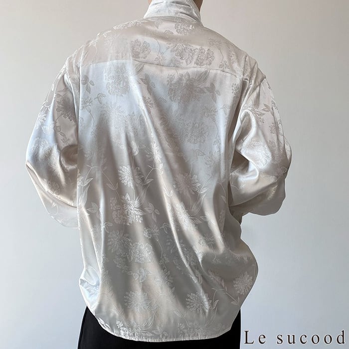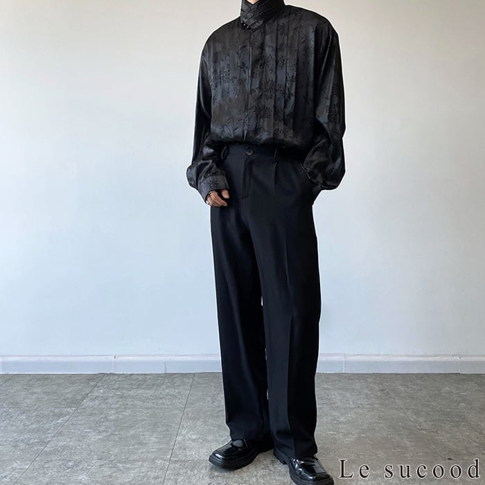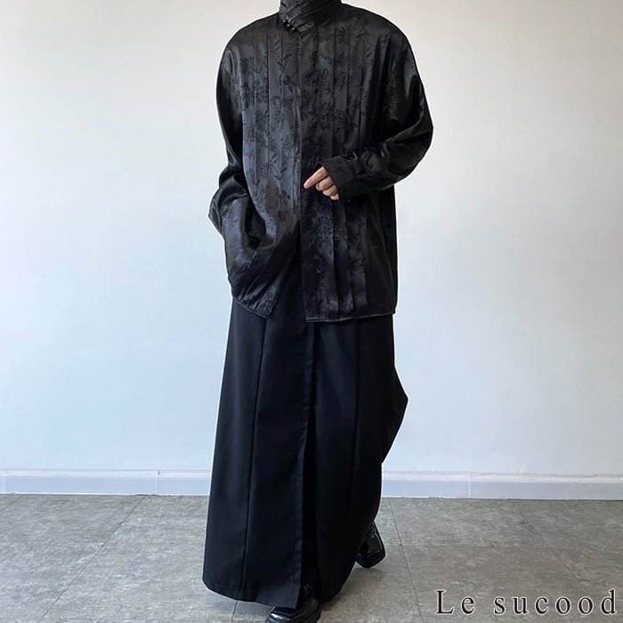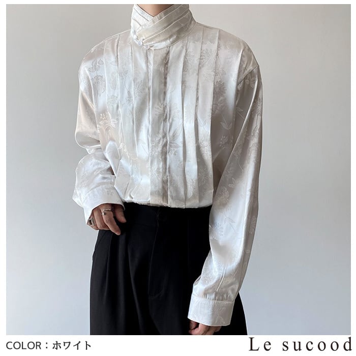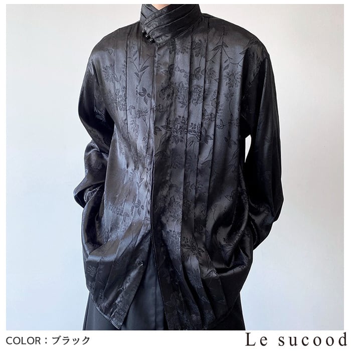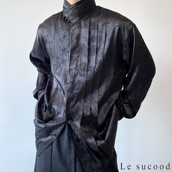 【お支払い確認後20日以内発送】Le sucood プリーツハイネック 花柄シャツ ハイネックシャツ プリーツシャツ デザインシャツ 総柄シャツ オーバーサイズシャツ ゆったり ドロップショルダー ルーズ レトロモダン 長袖 メンズ カジュアル ストリート モード系 サロン系 個性的 原宿系 青文字系 | Le sucood