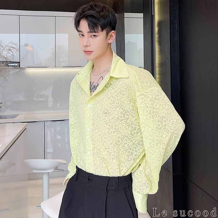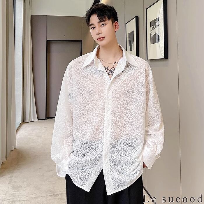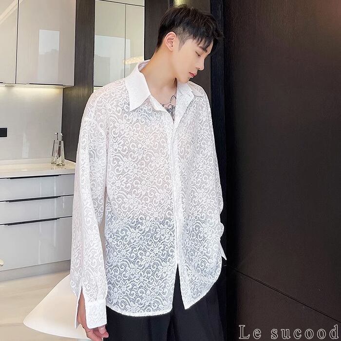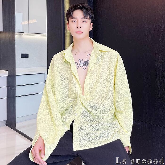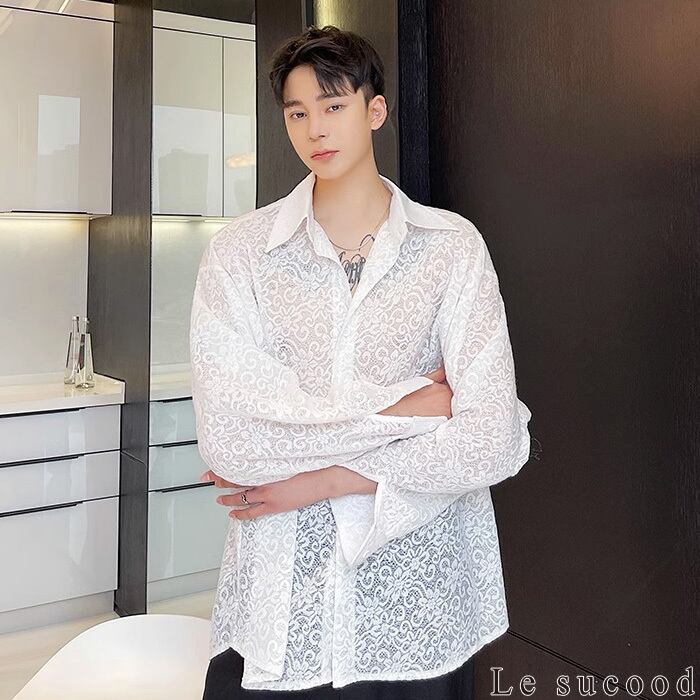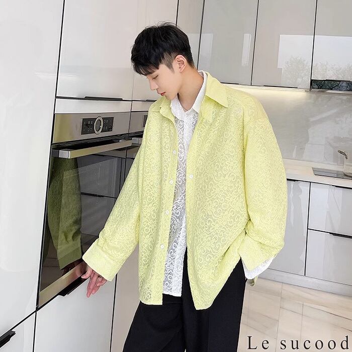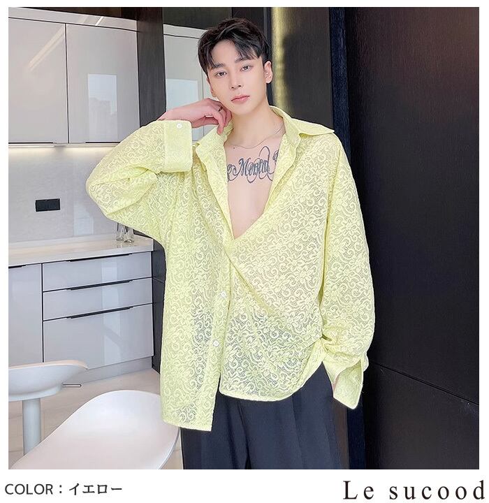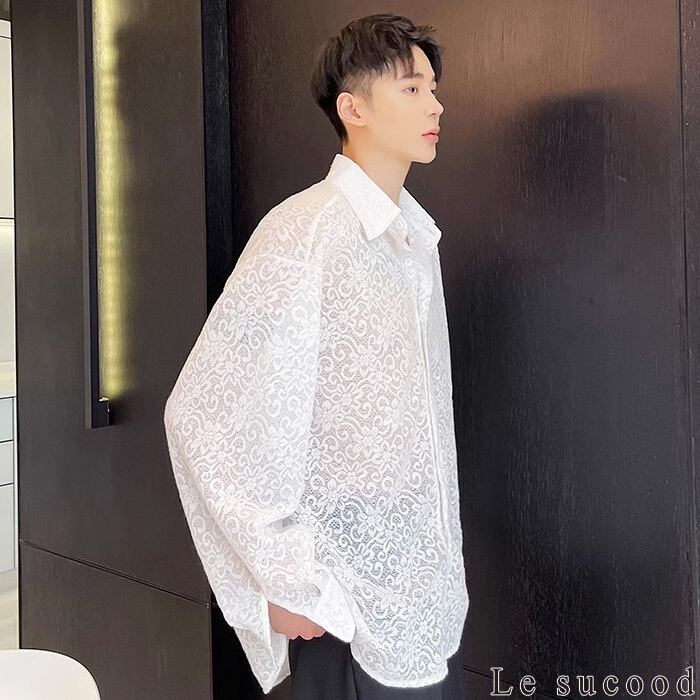 【お支払い確認後20日以内発送】Le sucood フラワージャガードレースシャツジャケット オーバーサイズシャツ シャツジャケット ドロップショルダー デザインシャツ ドレスシャツ ルーズ ゆったり 長袖 フェミニン メンズ カジュアル ストリート モード系 サロン系 個性的 原宿系 青文字系 | Le sucood