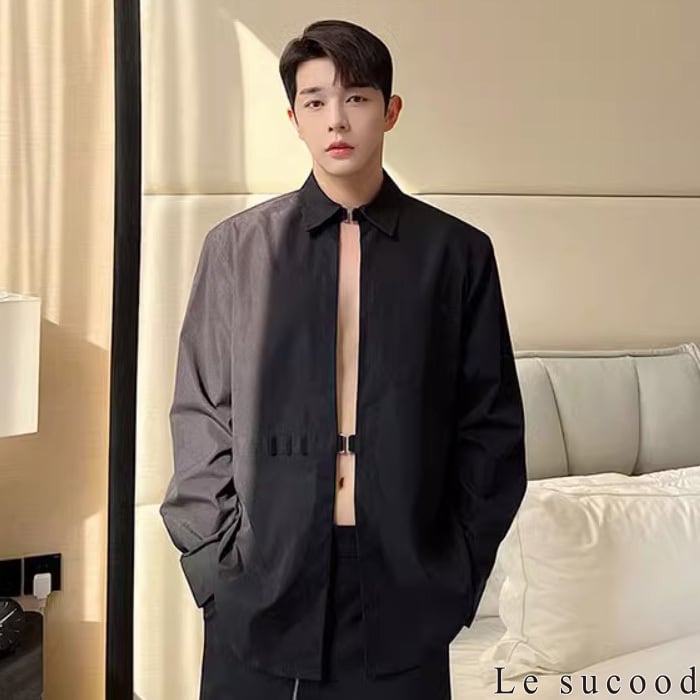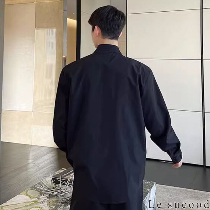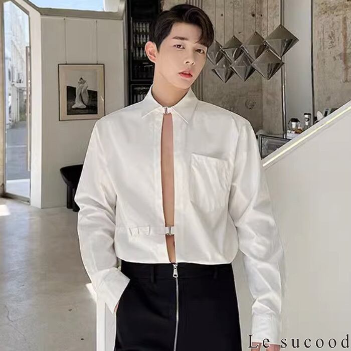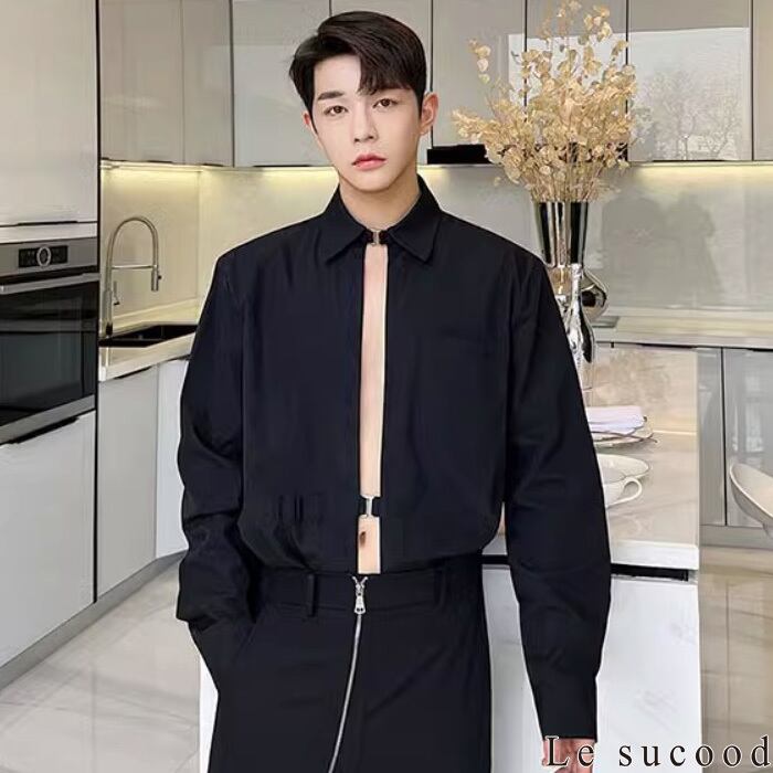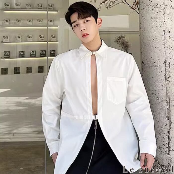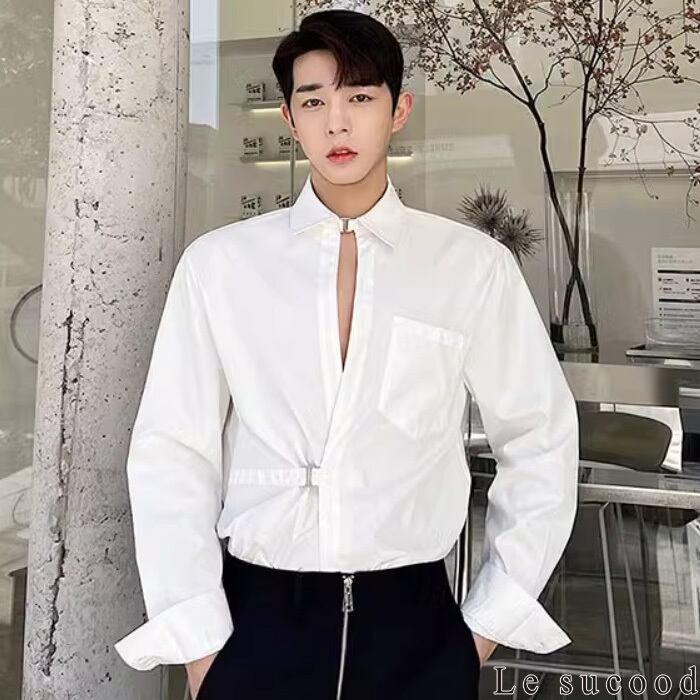 【お支払い確認後20日以内発送】Le sucood セクシーフロントオープンバックルシャツ メタルバックルシャツ スリットシャツ 変形シャツ デザインシャツ オーバーサイズ ルーズ モノトーン 無地 長袖 フェミニン きれいめ メンズ カジュアル ストリート モード系 サロン系 個性的 原宿系 青文字系 | Le sucood