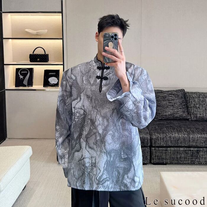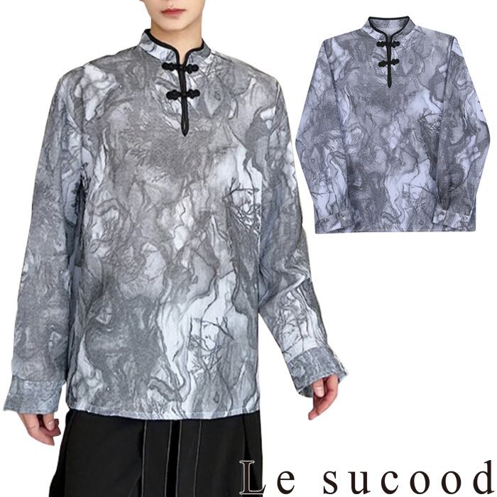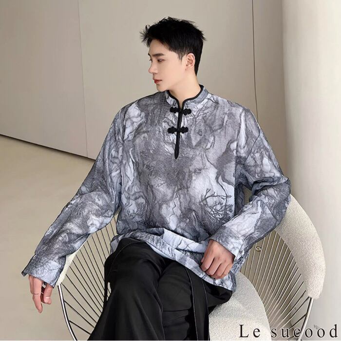 【お支払い確認後20日以内発送】Le sucood チャイナボタン モザイク柄シャツ メンズ チャイナシャツ プルオーバーシャツ スタンドカラーシャツ オーバーサイズシャツ ルーズシャツ 長袖 レトロ モダン エスニック アジアン 漢服 メンズ ストリート モード系 個性的 サロン系 原宿系 青文字系 | Le sucood