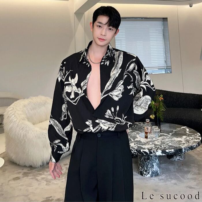【お支払い確認後20日以内発送】Le sucood フラワープリントブラックシャツ 花柄シャツ ルーズシャツ デザインシャツ オーバーサイズ ゆったり ダボシャツ ドロップショルダー タックイン 大人カジュアル モノトーン メンズ カジュアル ストリート モード系 サロン系 個性的 原宿系 青文字系 | Le sucood