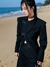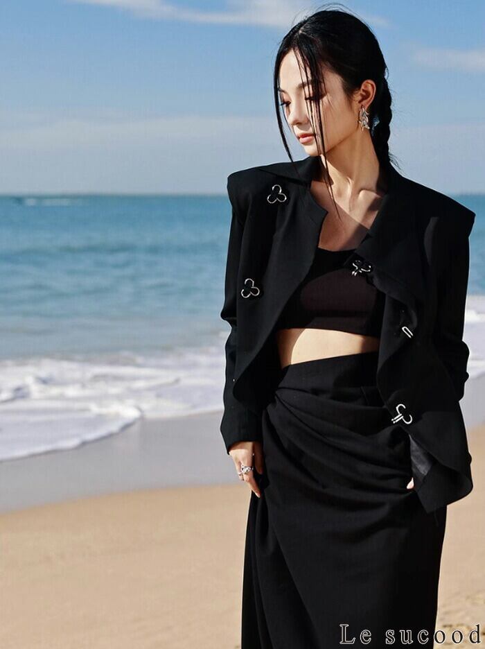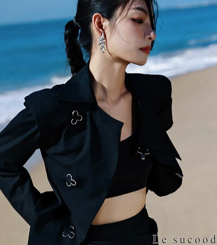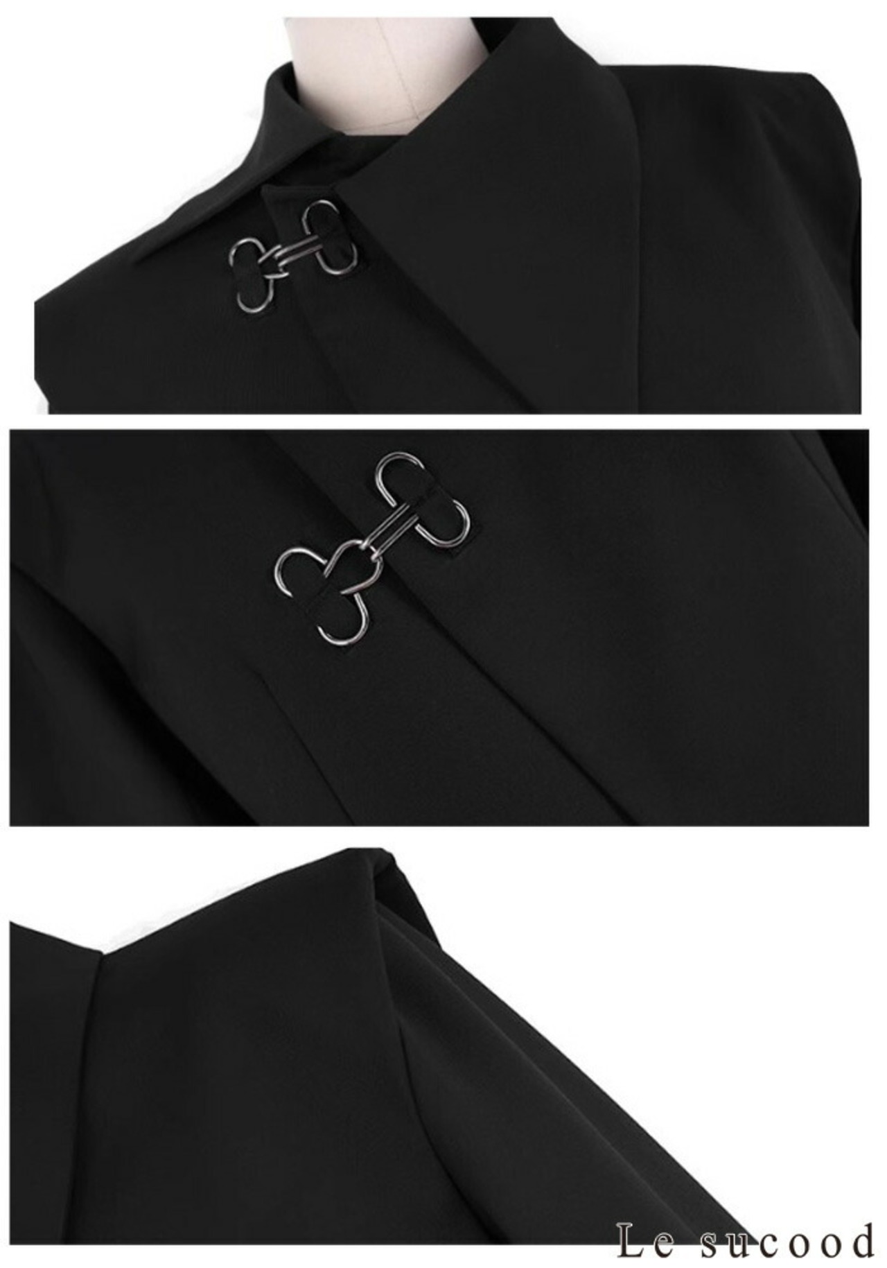 【お支払い確認後20日以内発送】Le sucood メタルバックル変形チャイナジャケット デザインジャケット チャイナボタンジャケット シングルブレストジェケット 羽織り メタルフック 長袖 カジュアル モノトーン 無地 レディース ストリート モード系 サロン系 個性的 原宿系 青文字系 | Le sucood