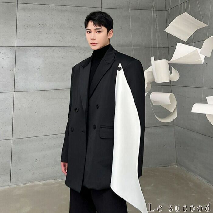 【お支払い確認後20日以内発送】Le sucood アシメコントラストダブルジャケット ダブルプレストジャケット アシメジャケット テーラードジャケット オーバーサイズジャケット ゆったり デザインジャケット カジュアル メンズ ストリート モード系 サロン系 個性的 原宿系 青文字系 | Le sucood