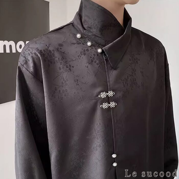 【お支払い確認後20日以内発送】Le sucood スタンドカラーチャイナシャツ スタンドカラーシャツ ハイカラーシャツ チャイナシャツ デザインシャツ 立ち襟シャツ ルーズ モノトーン 長袖 エスニック アジアン 漢服 メンズ きれいめ カジュアル ストリート モード系 サロン系 個性的 原宿系 青文字系 | Le sucood