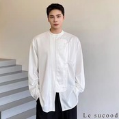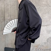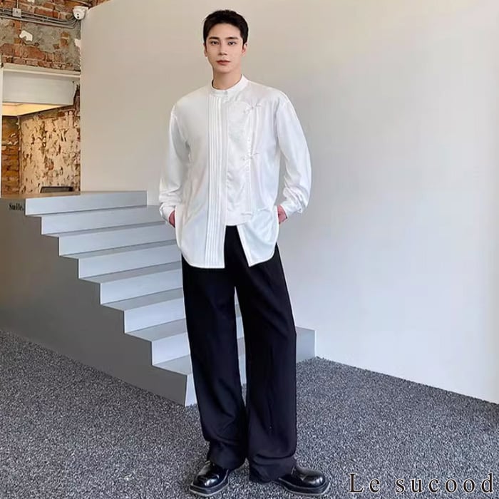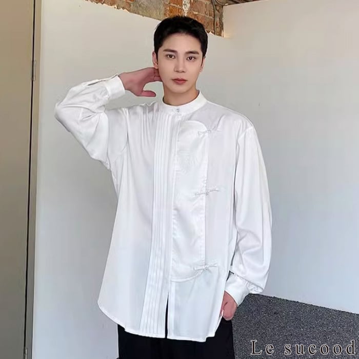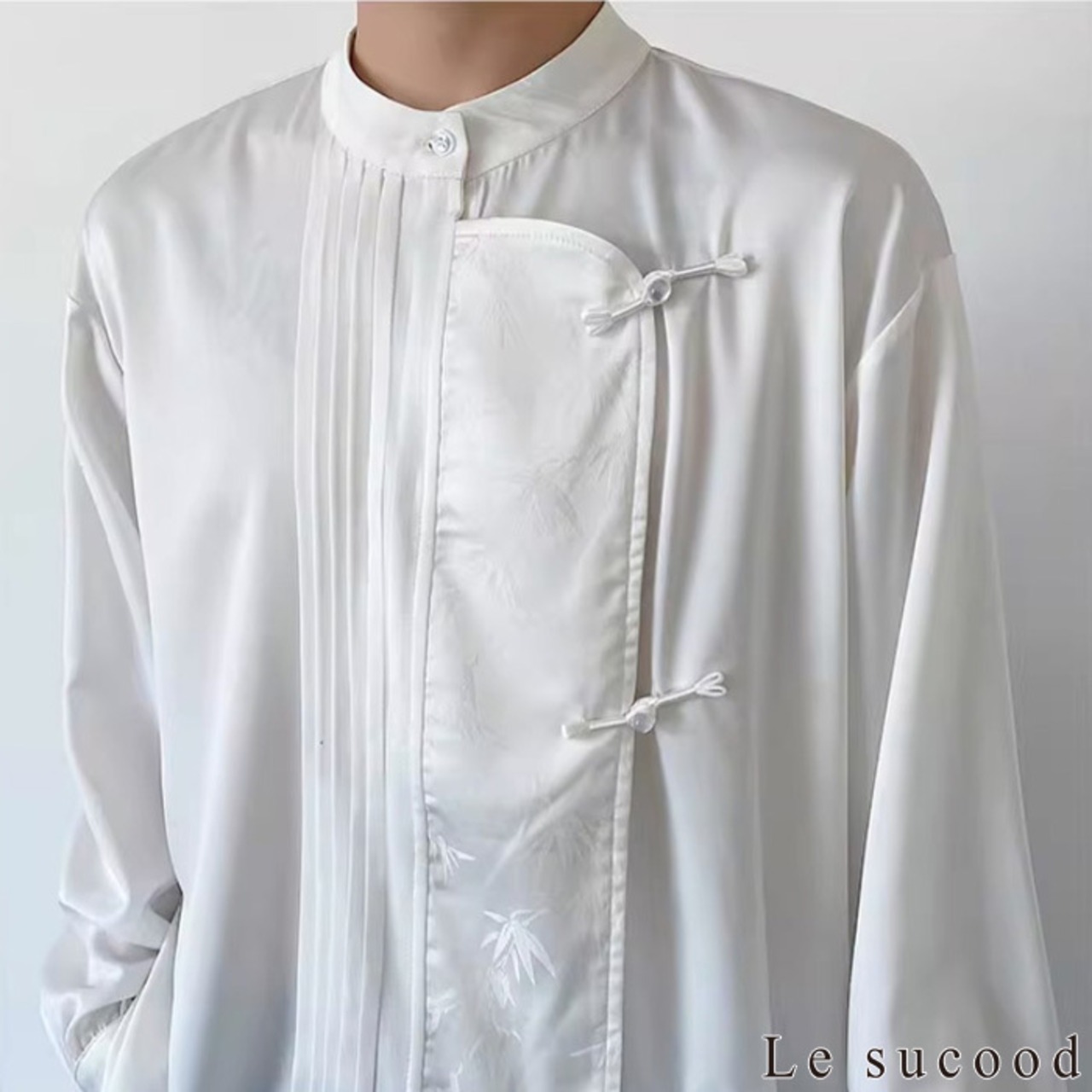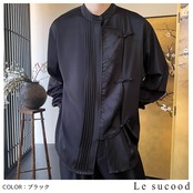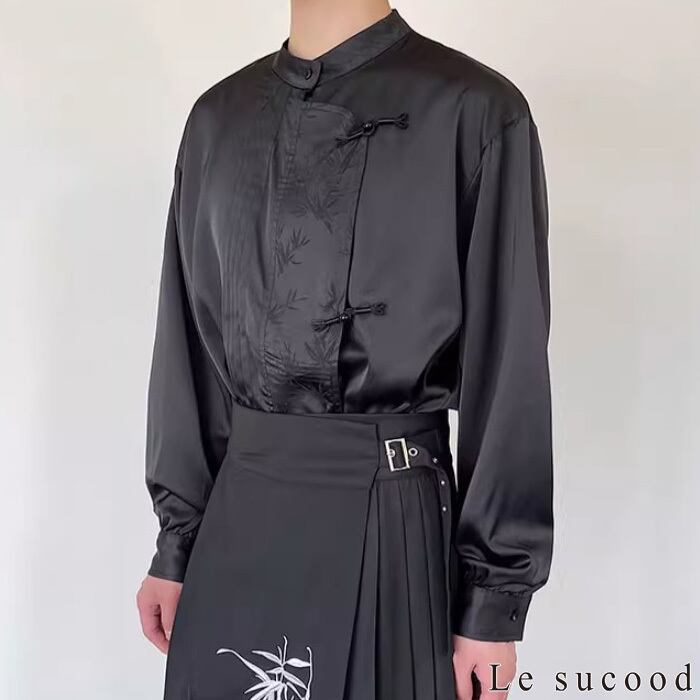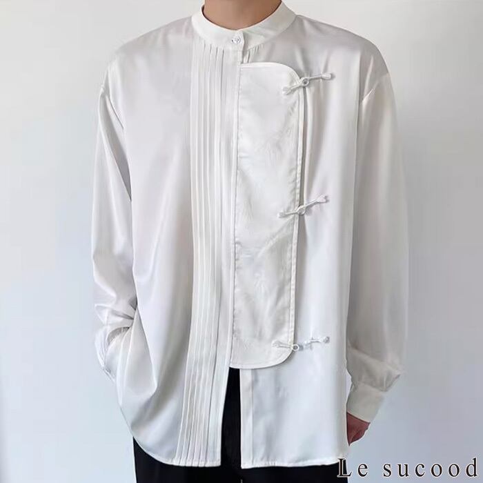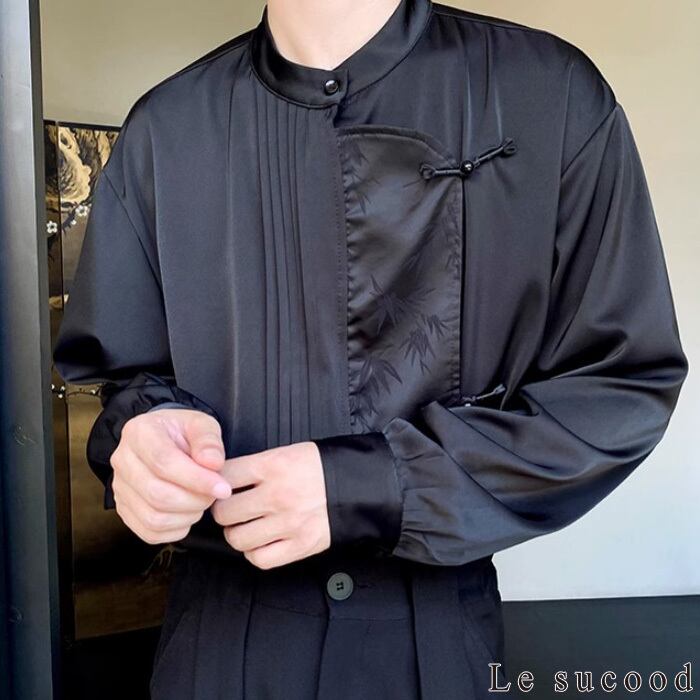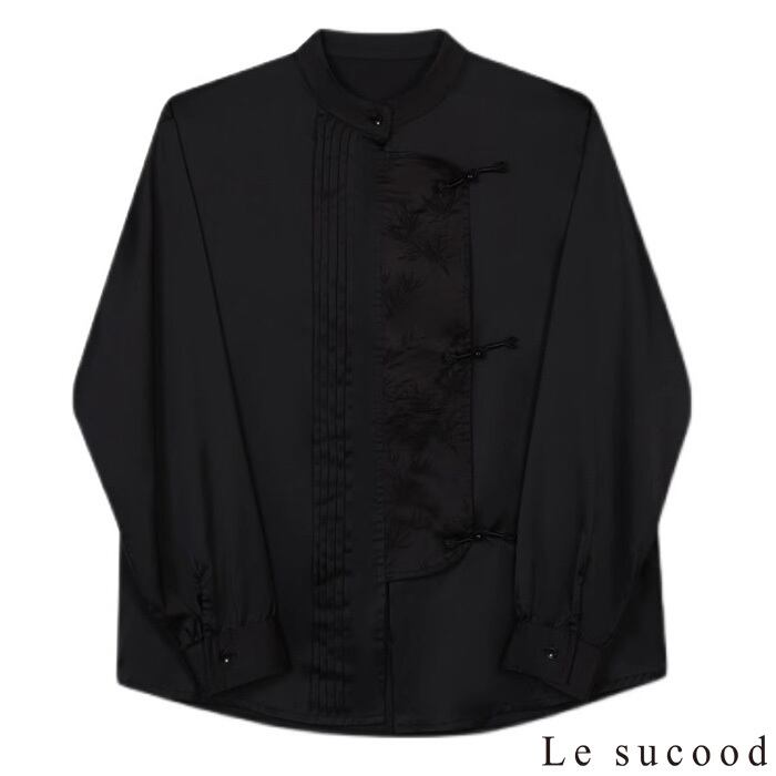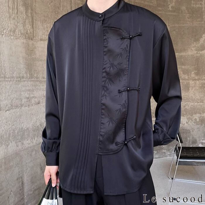 【お支払い確認後20日以内発送】Le sucood ノーカラー チャイナボタンシャツ 笹柄 メンズ チャイナシャツ モード系 ノーカラーシャツ デザインシャツ 変形シャツ アシメデザイン レトロ 長袖 エスニック アジアン 漢服 メンズ カジュアル ストリート モード系 サロン系 個性的 原宿系 青文字系 | Le sucood