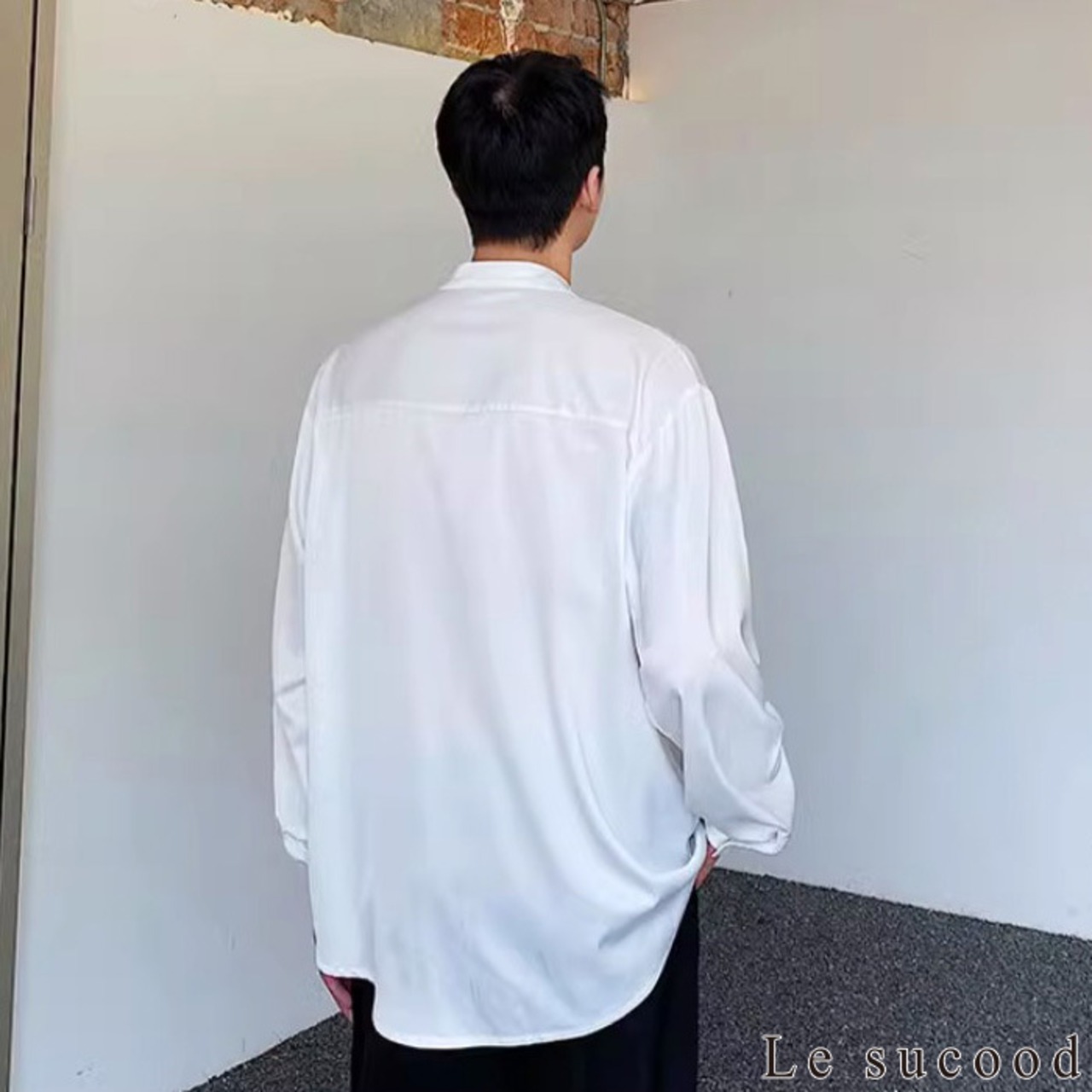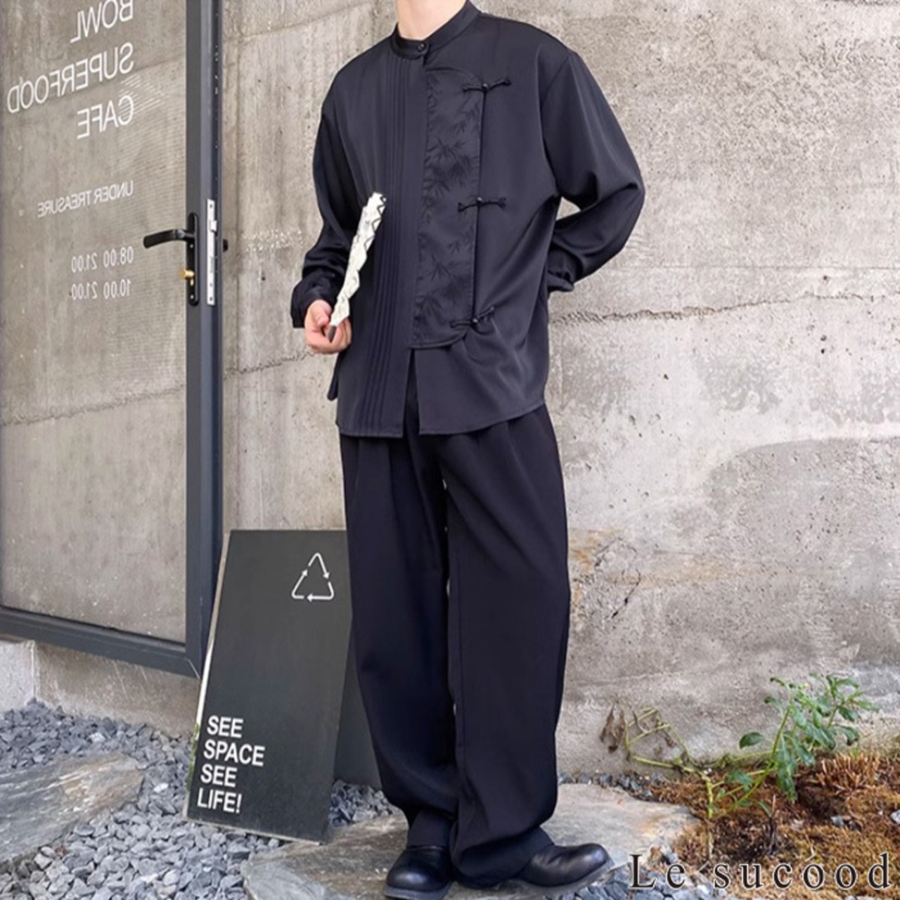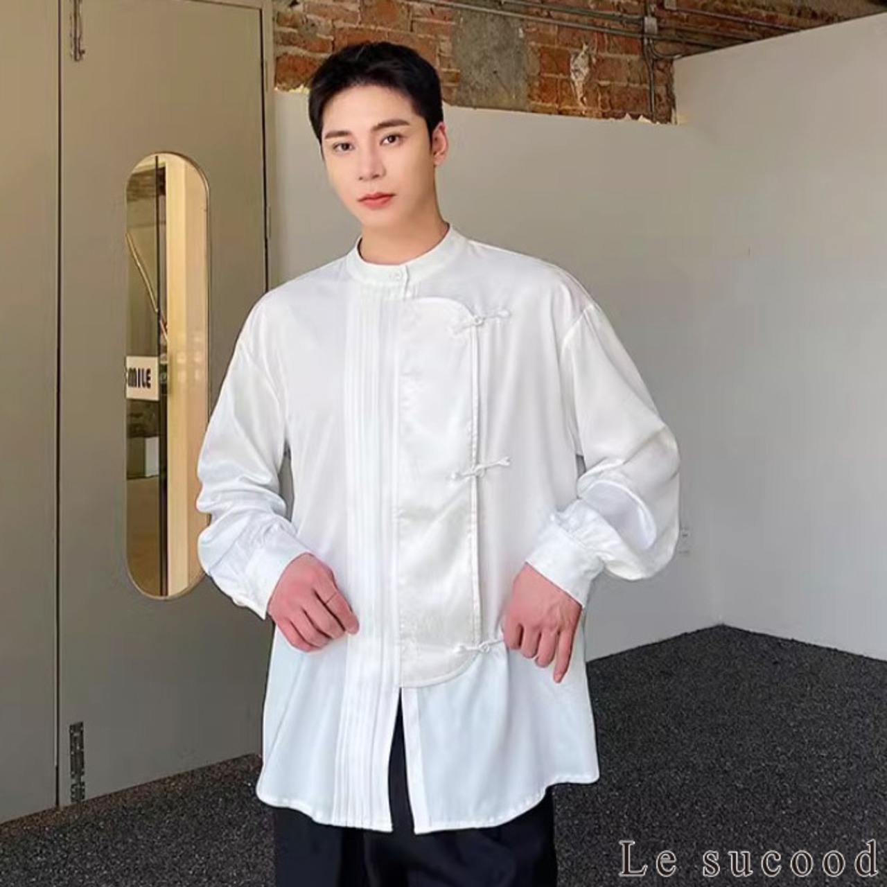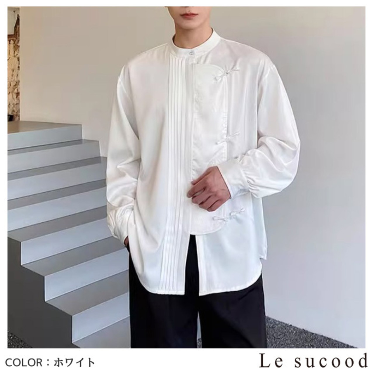 【お支払い確認後20日以内発送】Le sucood ノーカラー チャイナボタンシャツ 笹柄 メンズ チャイナシャツ モード系 ノーカラーシャツ デザインシャツ 変形シャツ アシメデザイン レトロ 長袖 エスニック アジアン 漢服 メンズ カジュアル ストリート モード系 サロン系 個性的 原宿系 青文字系 | Le sucood